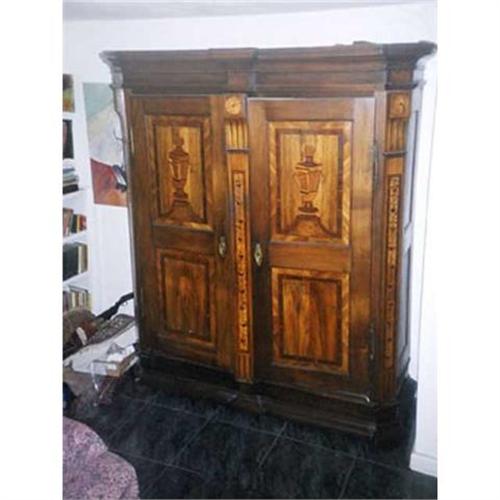 Polished Walnut, inlaid with other precious woods. It has double doors, each with two inlaid panels and original old locking mechanisims.Nussbaum und andere Edelhoelzer eingelegt und poliert; Zweituerig, je zwei Fuellungen, mit altem Schloss. Hoehe:2.19M Briete:2.01M Tiefe:.76M. Inquiries German or English/Anfragen, Deutsch oder Englisch. From a prominent private collection.F.O.B. San Diego.