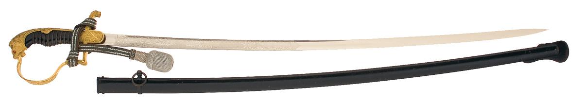 31 1/2" single fuller single edged curved blade, with etched checkerboard and floral scroll designs on either side and along the lightly curved spine, and a "Z in shield" stamp on the left ricasso. Gold finished hilt, with "d" shaped knuckle guard, decorated with a panther head on the rear quillion, crossed cannons on the right languet, floral and oak leaf patterns overall, wire wrapped celluloid grip and a lion head pommel with red eyes. With a silver wire and green leather portapee with silver acorn, and a black painted metal sheath.