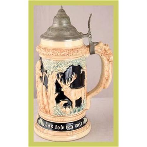 </STRONG>Title: 1940 German Large Barware Stein Hunter Deer Squirrel </STRONG><P>Item #: 7-461-0</P><P>Comment: A nice large piece with beautiful detail makes the perfect addition to your collection! Notice the squirrel on the handle! Says in German, Jagd und Bier das lob ich mir (Beer and hunting are my favorite things!)</P><P>Condition: In overall very good condition. Some crazing due to age and use.</P><P>Dimensions (in.): 13.25H 8.5W 6D </P><P>Age (ca.): 1940</P><P>Origin: Germany</P><P>Size: Large</P><P>Style: Barware</P><P>Material: Ceramic</P><P>Material 2: Pewter</P><P>Object: Stein</P><P>Subject: Hunter Deer Squirrel</P><P>Piece Type: Barware & Wine Related Items</P>German Hunter Deer Squirrel Stein Large Barware Ceramic