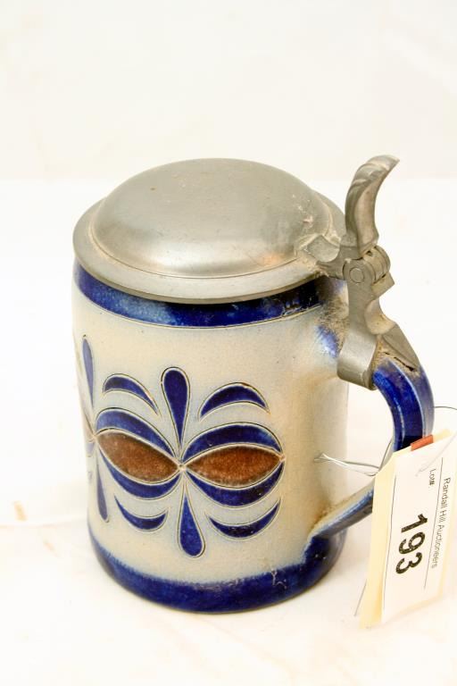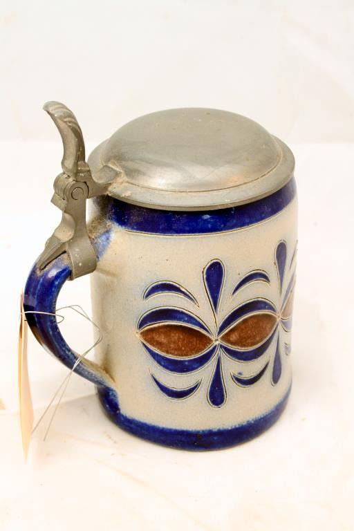 German Beer Stein w/ Pewter top. Blue glaze designs about 5 1/2 fine condition.