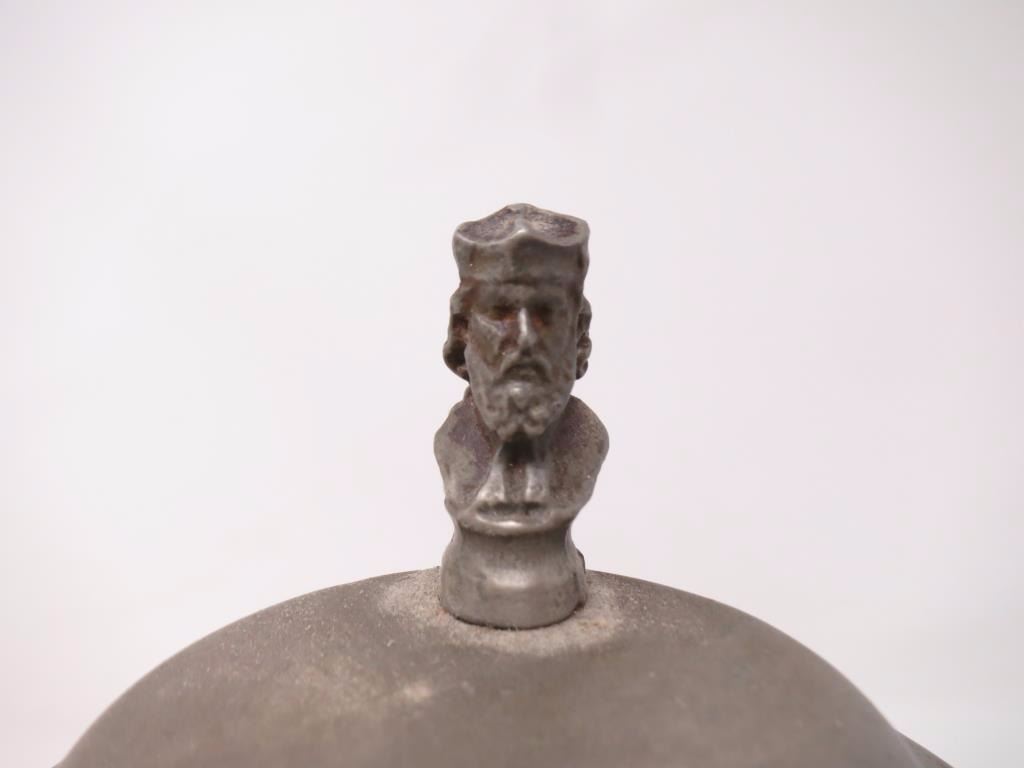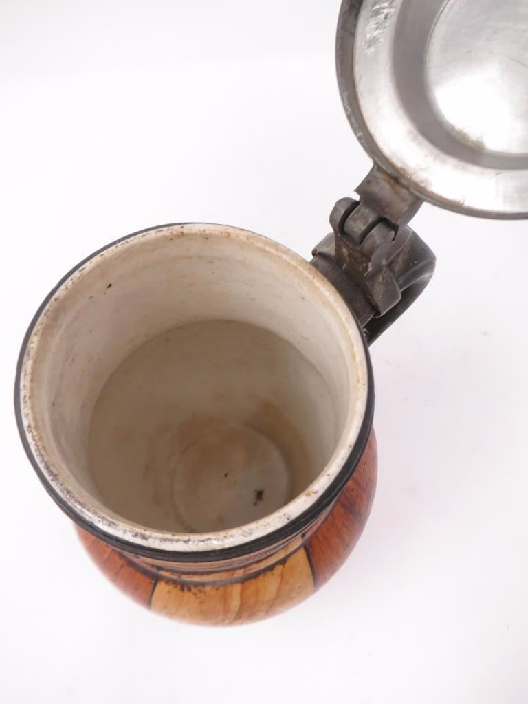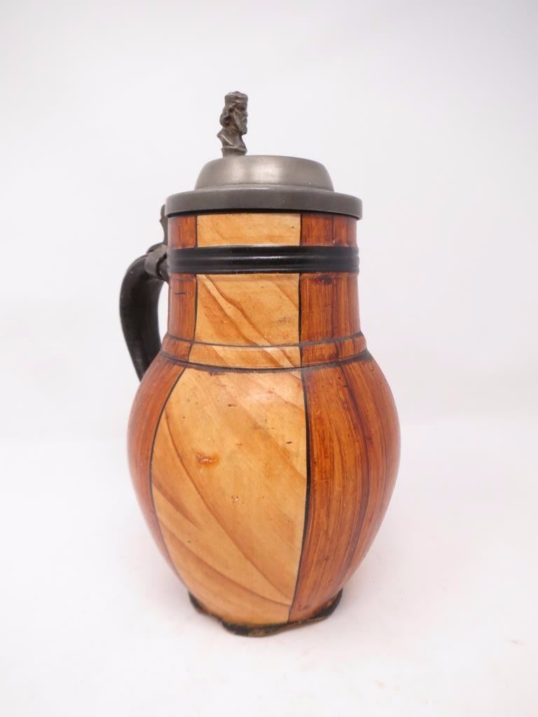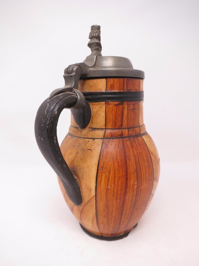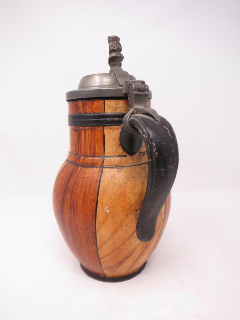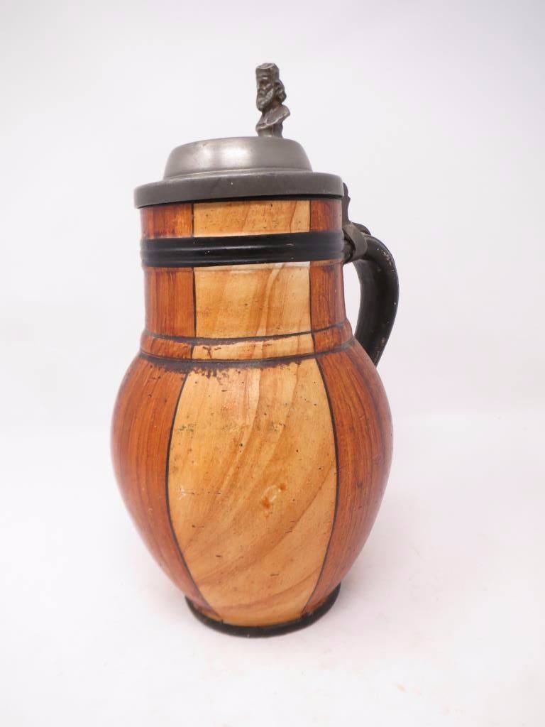 With pewter top, wood grain glaze. About 10x6. There is a chip around the base.
