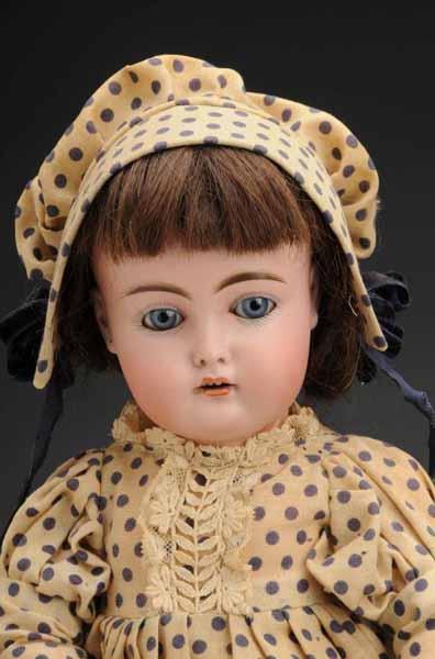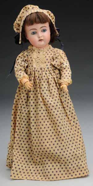 Description Germany, Ca. 1900. Bisque socket head, incised "S", unknown maker, but excellent quality bisque with a Kestner look, sleeping eyes, open mouth with lip shading and teeth, pierced ears (tiny nick), vintage human hair wig. Jointed composition body (some wear and scuffs). Newly made dress from vintage cotton. Condition (Very Good). Size 18" T.
