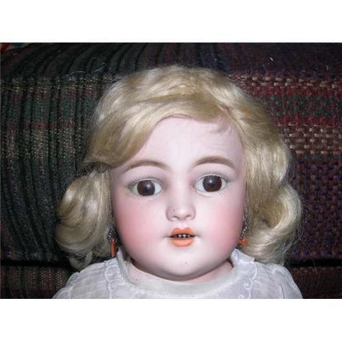 This is a German made doll. I'm not sure which company made her but she is marked Germany 7 1/2 and Imperial. She is on a kid body that is jointed at the hips and the knees. Her arms are attached at the shoulders. There is one finger on the left hand that is broken. She has a nice light blonde mohair wig. Her eyes open and close and still have the wax on them. She has feather painted eyebrows and painted upper and lower lashes. She has an open mouth with teeth and she has pierced ears.