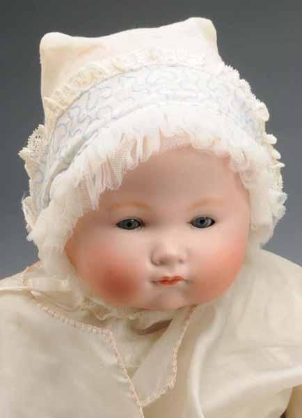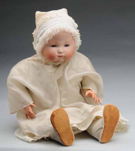 Description Germany, Ca. 1925. Bisque flange head incised "Germany Kiddiejoy", solid dome head, sleeping eyes, closed pouty mouth. Cloth body with perfect celluloid hands (torso recovered). Vintage baby clothes and shoes. Condition (Excellent). Size 19" T.