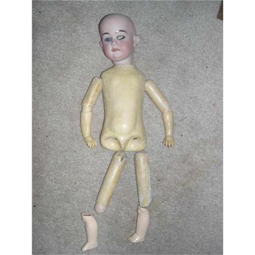 Here is a bisque head doll marked 1 2/2 P. Sch. A.M. The head circumference is 8 1/2". One eye is broken but included as the surface is good enough to be set into the eye socket. Both bottom leg/foot piece is new. This is a fix it up project for someone. The head has an old hairline on the top rim in the back.It will be covered with a wig. She is from a smoke free environment. Buyer to pay $15 for shipping,insurance, and handling. Thanks for viewing.