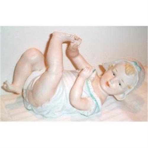 This fantastic German Bisque Porcelain Piano Baby is lying on her stomach. She is in good condition with no chips, cracks, dings or hairlines but does have one of her index fingers missing. She measures 10" long and is about 6" tall to the top of her sweet bonnet.