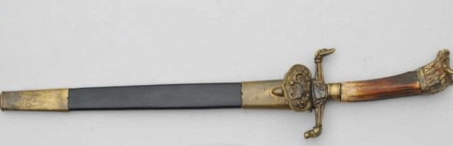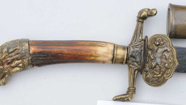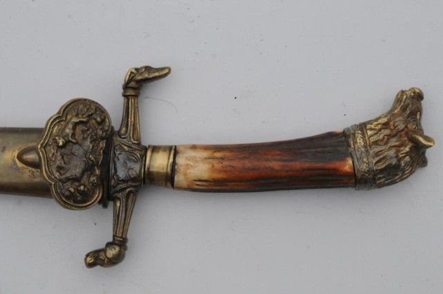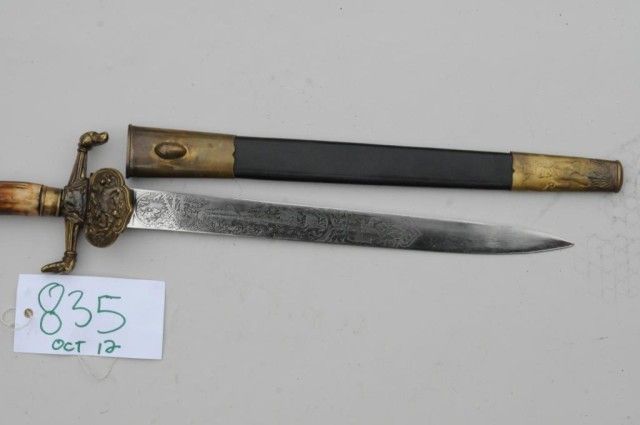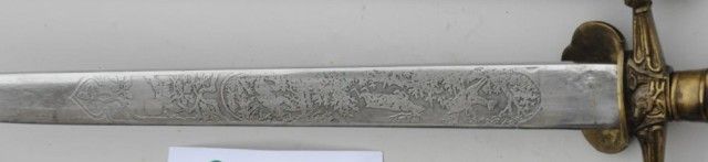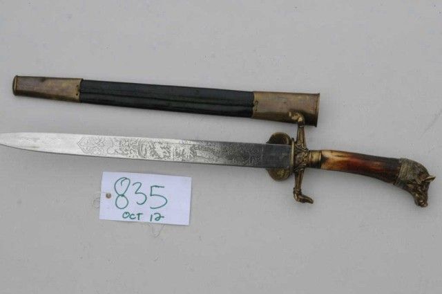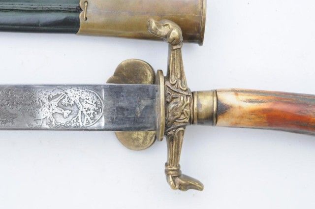 German Boar Hunting Sword with fancy cast mounts, etched blade and scabbard circa late 19th to early century. The pommel cap is a great likeness of boar and hunting scenes on blade, very good condition overall. Est.;$600-$1,200