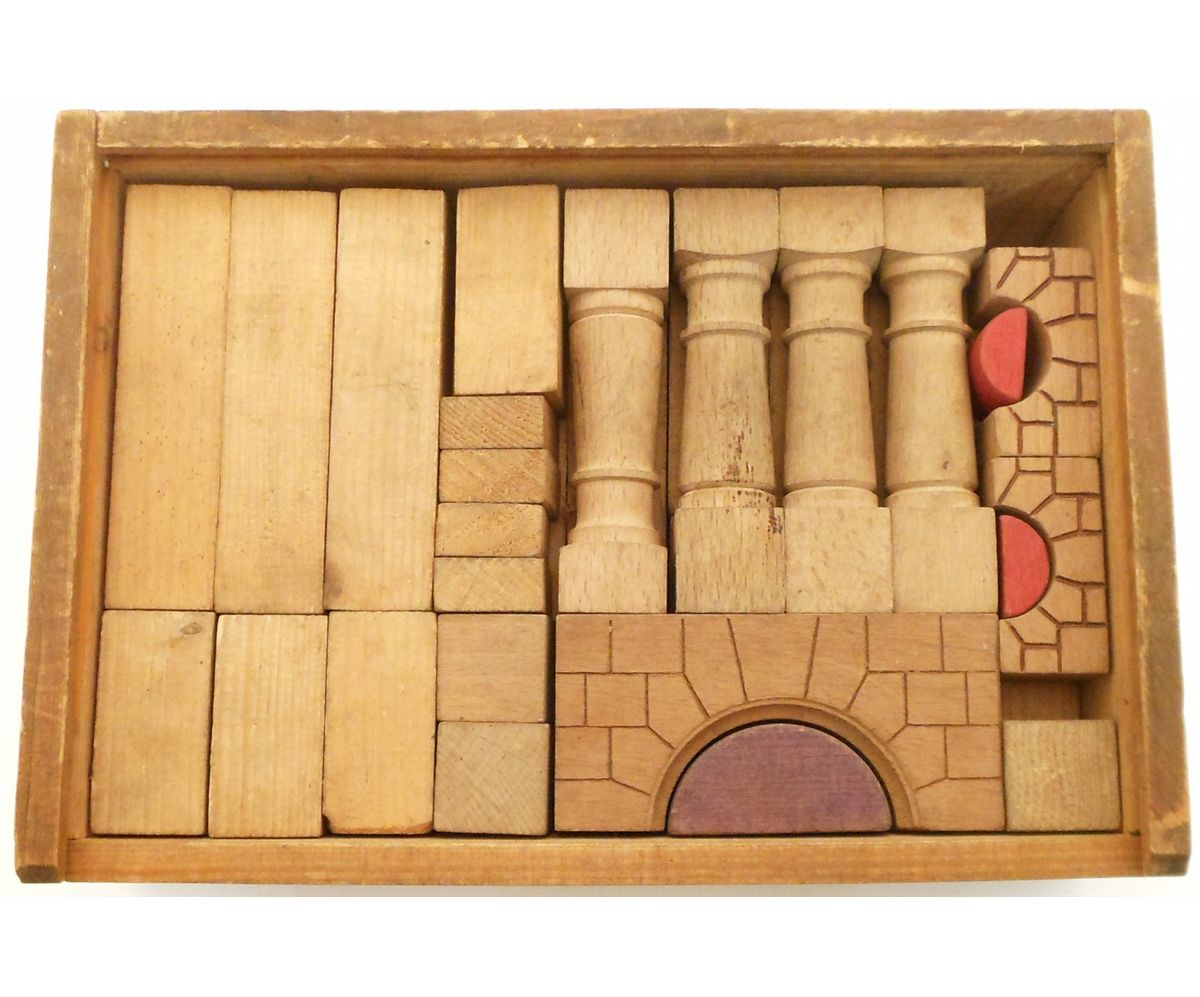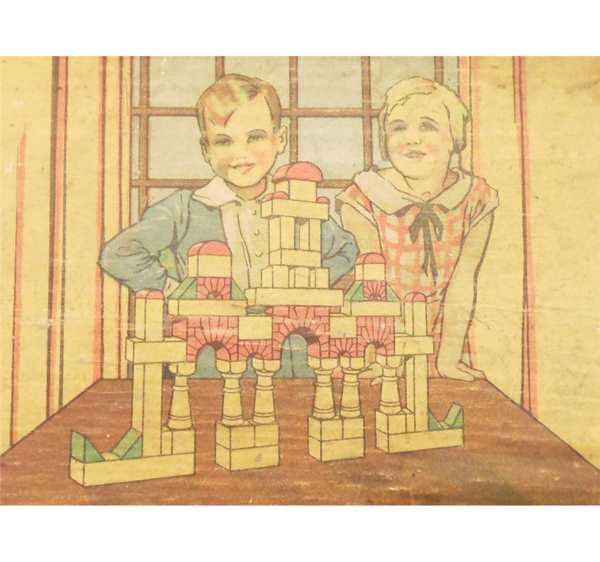 German Building Block Set. Turn of the Century. In a Wooden Dovetailed Box that measures 11 1/2" X 8" X 3 1/4" Tall. Great Condition with some wear to the box and writing on the inside of the lid an on some blocks (pencil & crayon). (See Pictures)