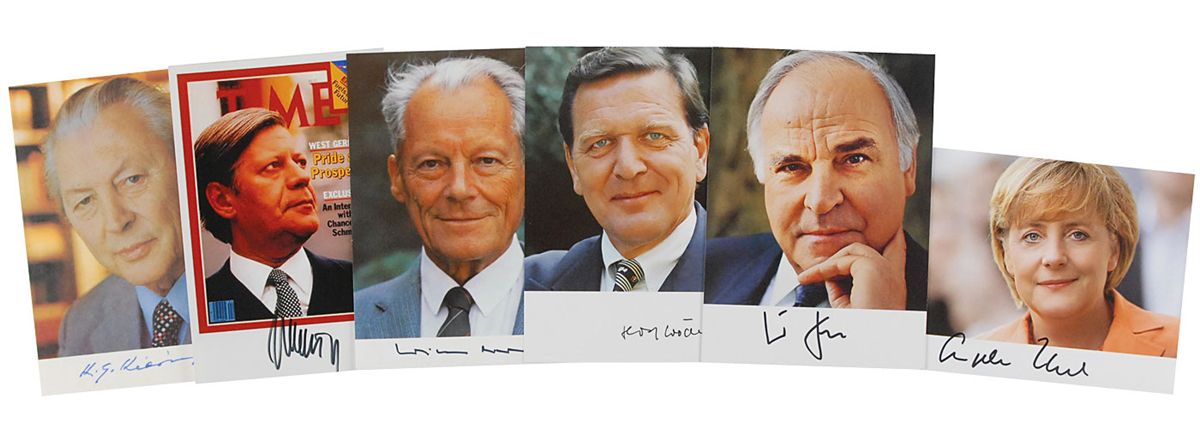 Collection of six color photos of different German chancellors, 4 x 6 and 6 x 4, each signed in felt tip by the leader pictured, including: Angela Merkel, Helmut Kohl, Helmut Schmidt, Willy Brandt, Kurt Georg Kiesinger, and Gerhard Schroder. In overall fine condition.