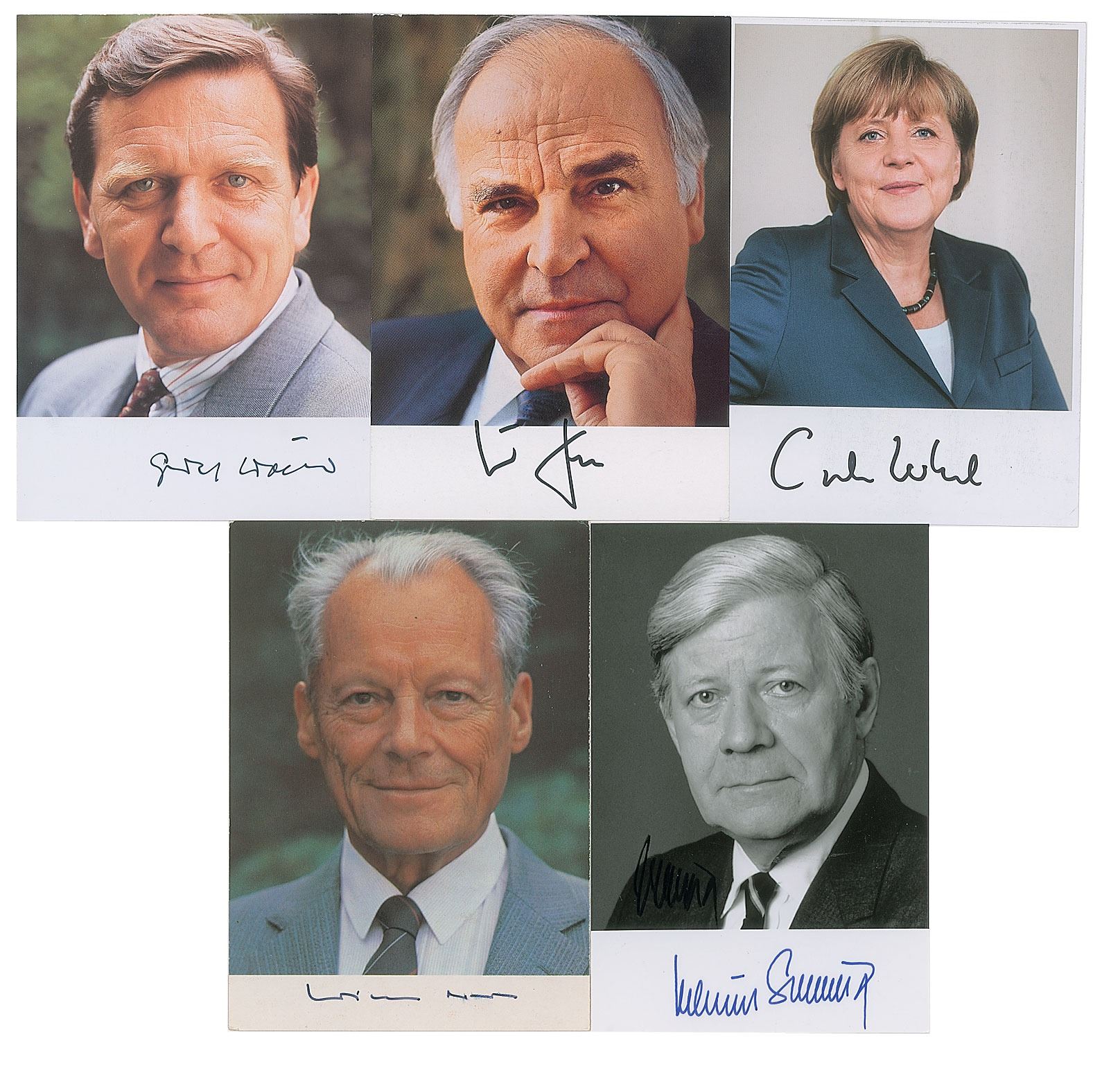 Group of five semi-glossy photos, mostly cardstock, each approximately 4 x 5.75, each signed in ink or felt tip by a German chancellor, including: Angela Merkel, Helmut Kohl, Gerhard Schroder, Helmut Schmidt, and Willy Brandt. The Schmidt photo also bears a preprinted signature to lower border. In overall fine condition.