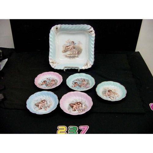 Marked MPM, Made in Germany, circa 1900-1910, square shaped bowl with transfer design winged cherubs in a floral ground covering, swirled porcelain sides of the bowl, set of 5 matching individual berry bowls. All of the pieces have small age cracks that are hard to detect but there.