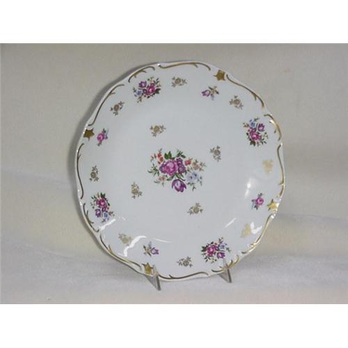 11'' diameter white plate with floral sprays and gold highlights on scalloped border. Marked "Fine China Made in German Democratic Republic" and with maker's mark, as shown in photo. Condition is very good.
