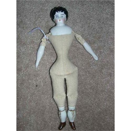 This china doll is 9". It is an old German produced head with the number 6 on the back. The head is 2" tall. It is on a newer made tightly packed body. There is a tag onthe back that says Wimer's Yucaipa, Calif. Her facial features are nicely done. The body is made so she can sit. If you like to dress dolls, she will be a geat project. I love the thin waist. She is from a smoke free environment. Buyer to pay $10 for shipping, insurance and handling. Thanks for viewing.