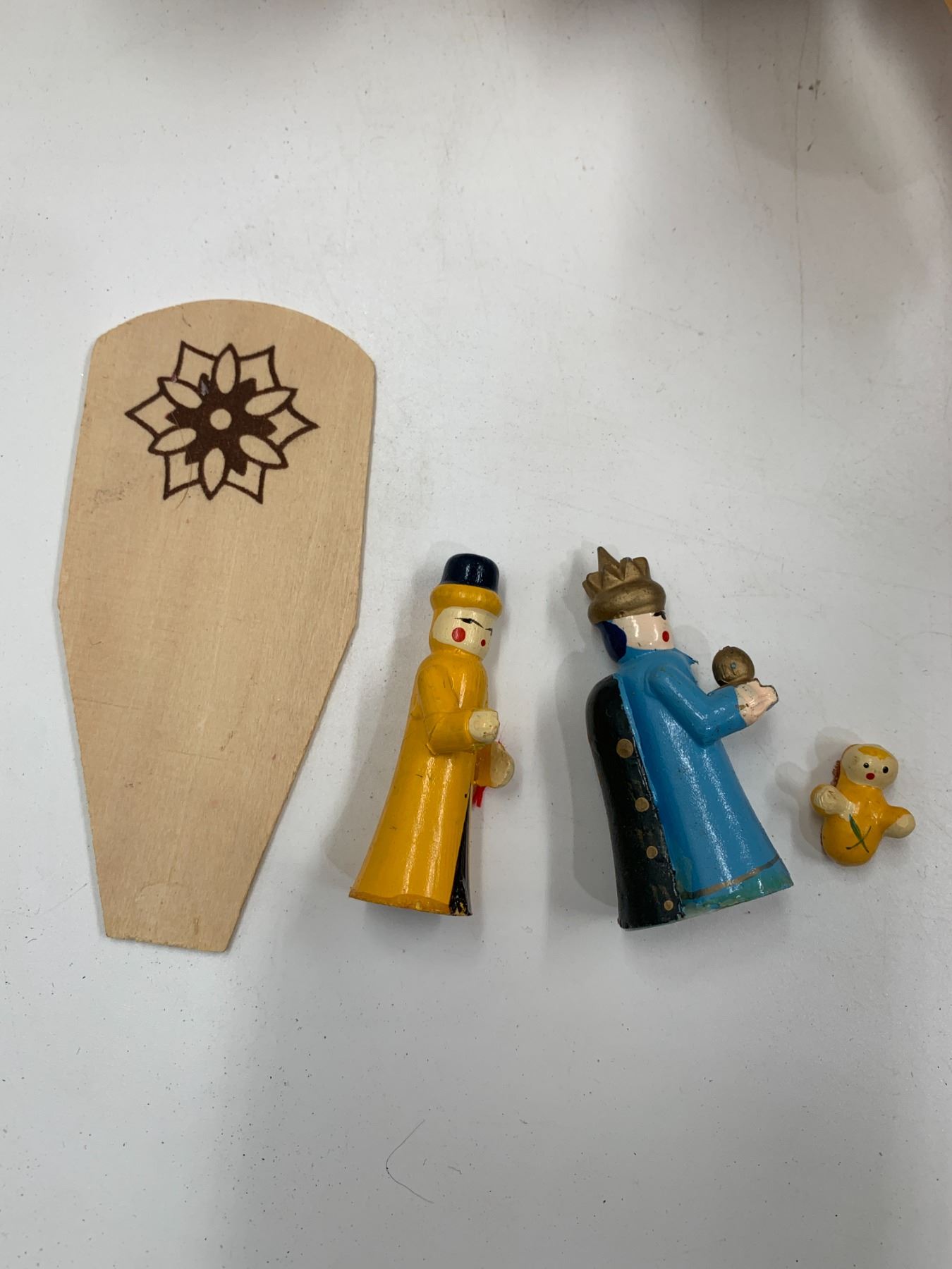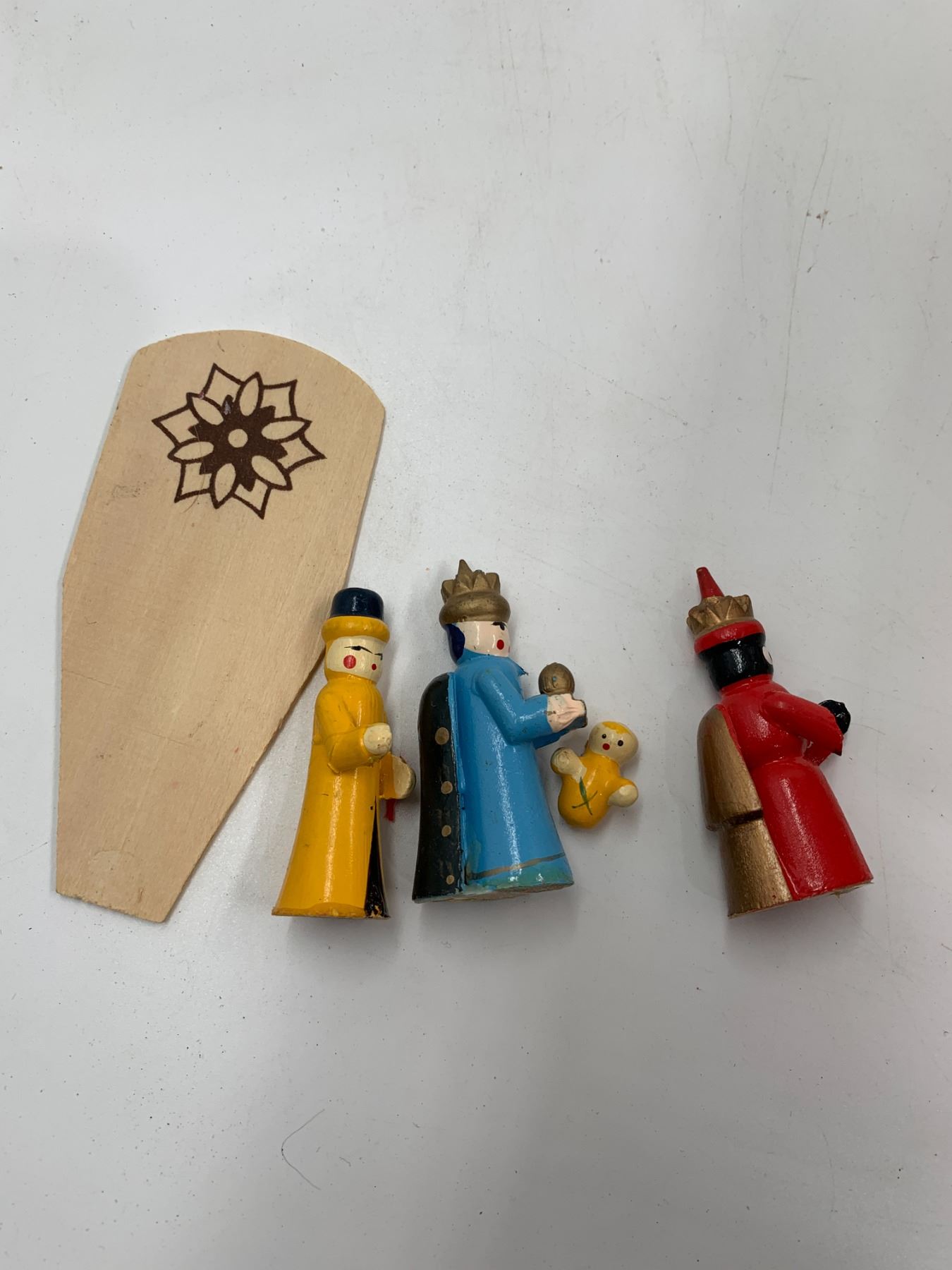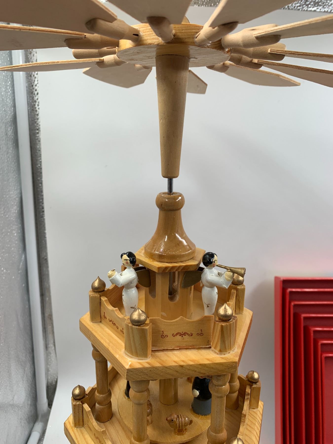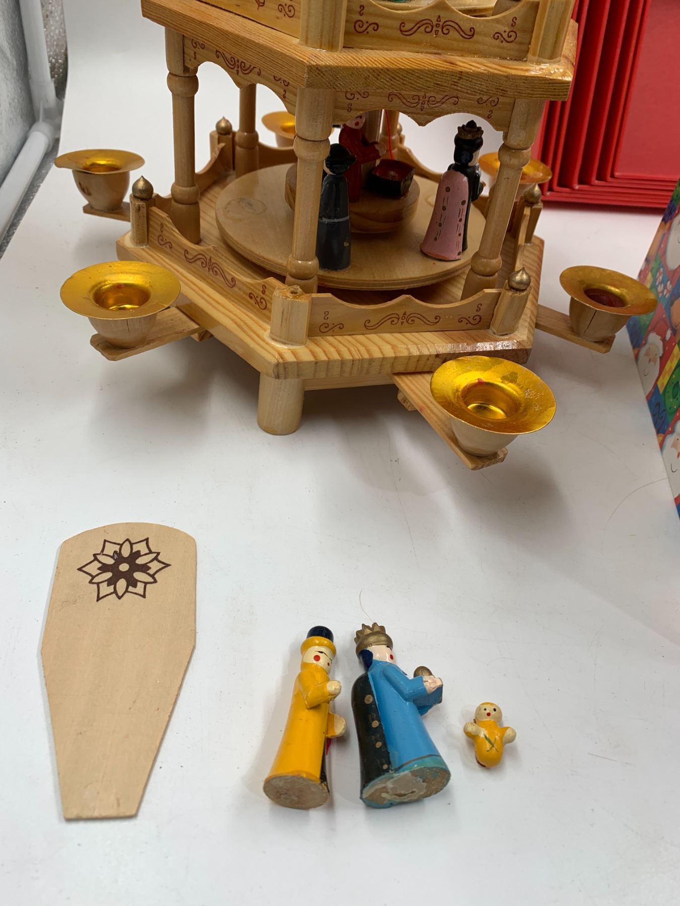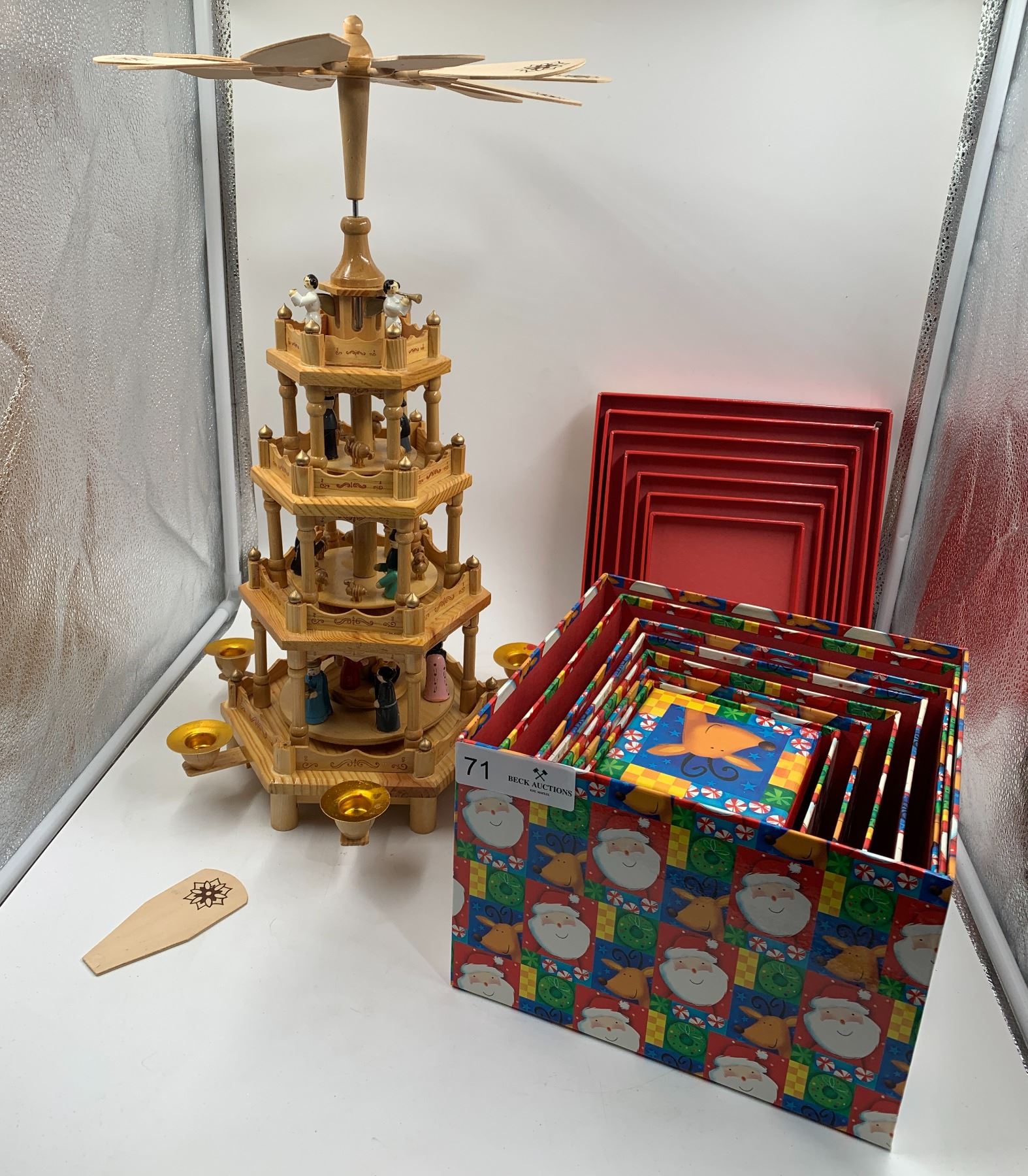 German Christmas Pyramid with Center Carousel. (Candles not included) Some pieces need to be re-glued. Also included are nesting Christmas Christmas Gift boxes.