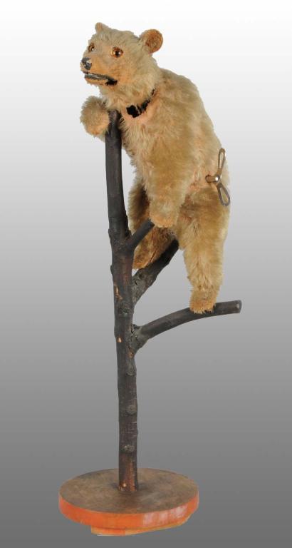 Description Fur covered with glass eyes and articulated mouth. Bear sits in 20" tall tree. When wound bear's head bobs and mouth opens. Key present. Condition (Excellent). Size Bear: 14" T.