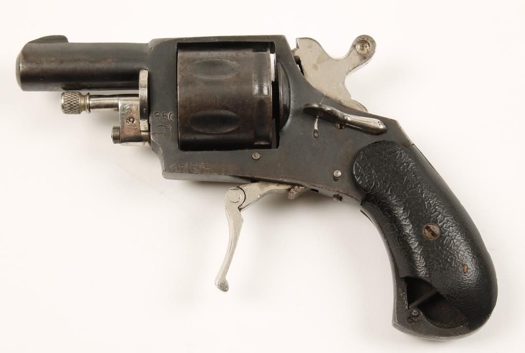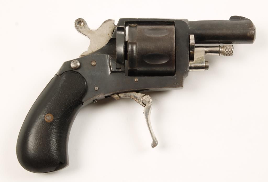 Double action folding trigger six-shot revolver with a safety. Crown over N proof. Finish is blued with fading to grey and showing evidence of surface rust. 1-13/16" barrel with uneven surface in the bore but visible rifling. Nickeled trigger, hammer, safety lever, ejector and cylinder pin. Both grips are missing pieces. Condition is fair to good. *Antique Firearm*