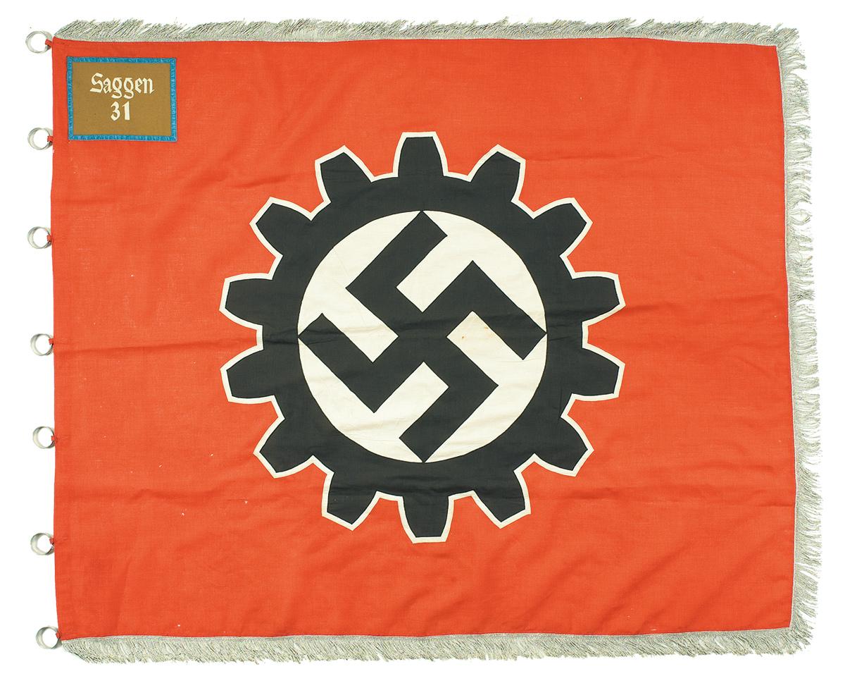 Established in 1933, the Deutsche Arbeitsfront (German Labor Front) was a Nazi-run replacement for the Weimar-era trade unions, and served as a parent organization for the RAD. Measures 45" tall and 54" long, red field with stitched cloth logos in the center on either side. In the upper corner is a brown patch with blue trim, embroidered in white "Saggen/ 31". Saggen is a district in Innsbruck, Tyrol, Austria. Along the spine is a set of 7 hanging rings, all with the RZM "M3/40/39" stamp (Cosan Brothers, 1939).
