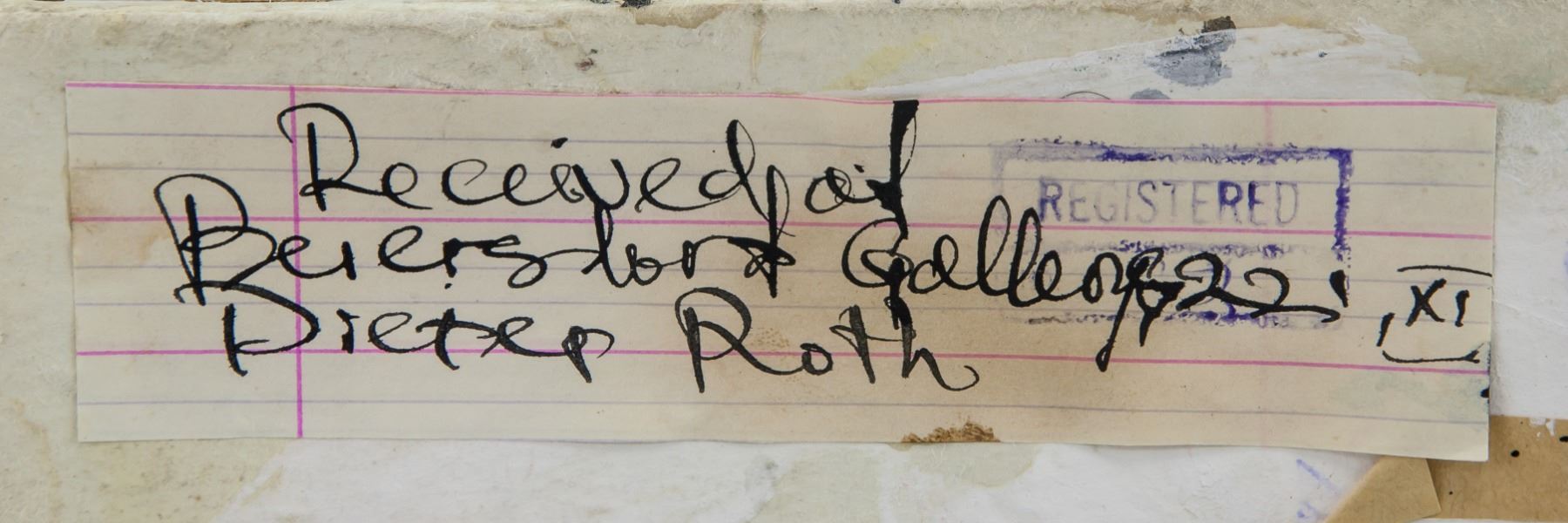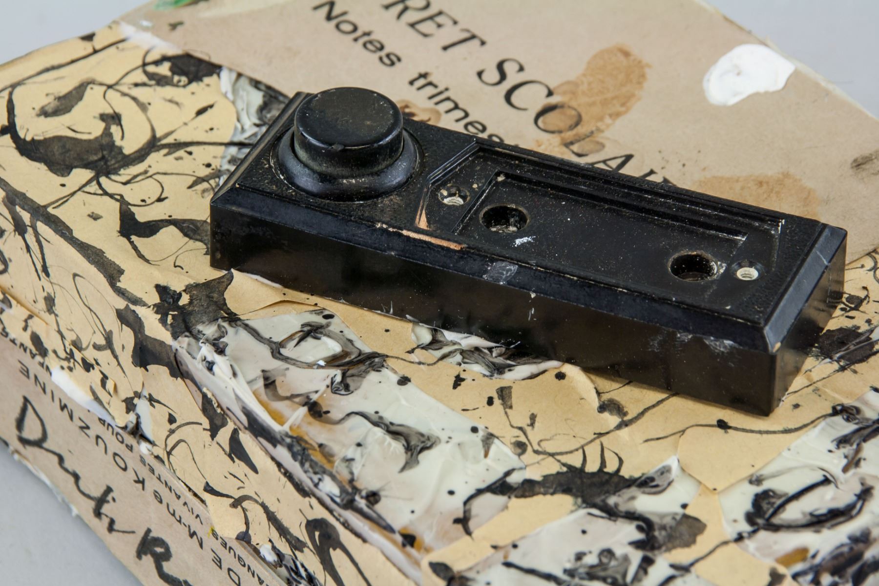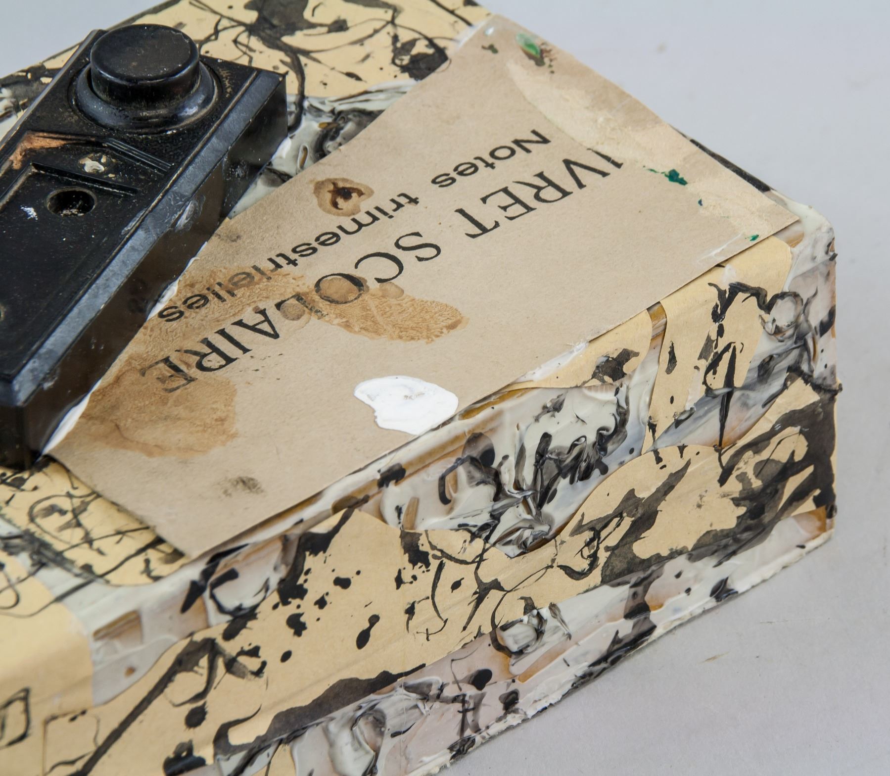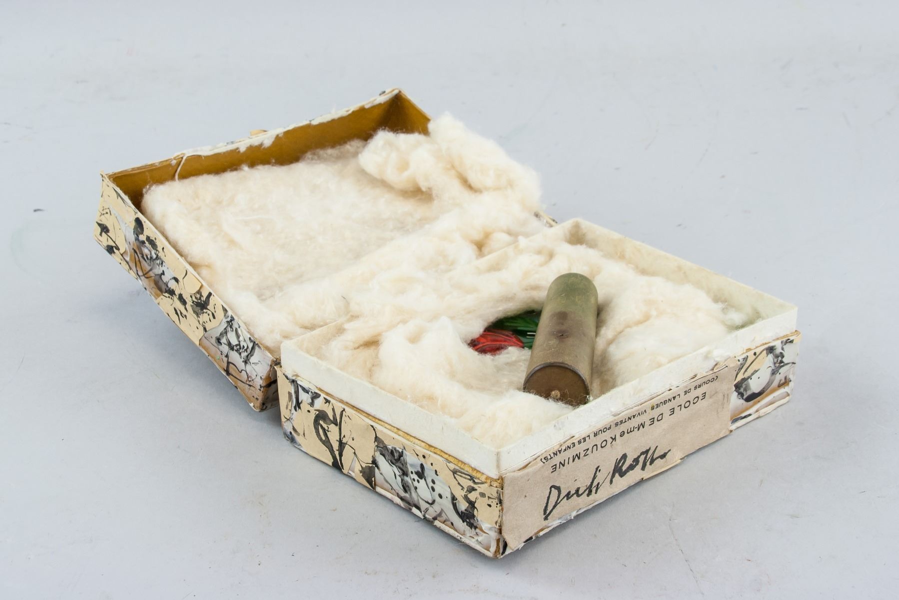 Mixed media, featuring a box. Signed illegibly with last name Roth on the base of box. 12 x 6 x 17 cm (4.7 x 2.4 x 6.7 inches)