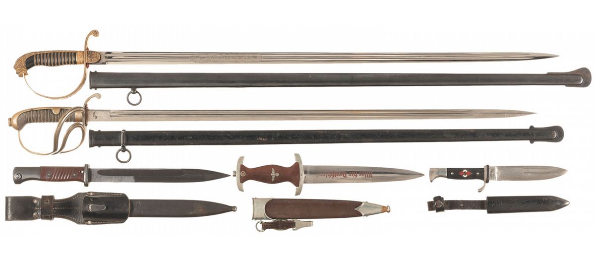 Zoltsch Murchen officer's sword with scabbard, Christian Sewer SA service dagger with sheath, RZM Hitler Youth knife with sheath, 44 fnj bayonet with scabbard, Ernst Busch Solingen sword with scabbard. Overall very good.