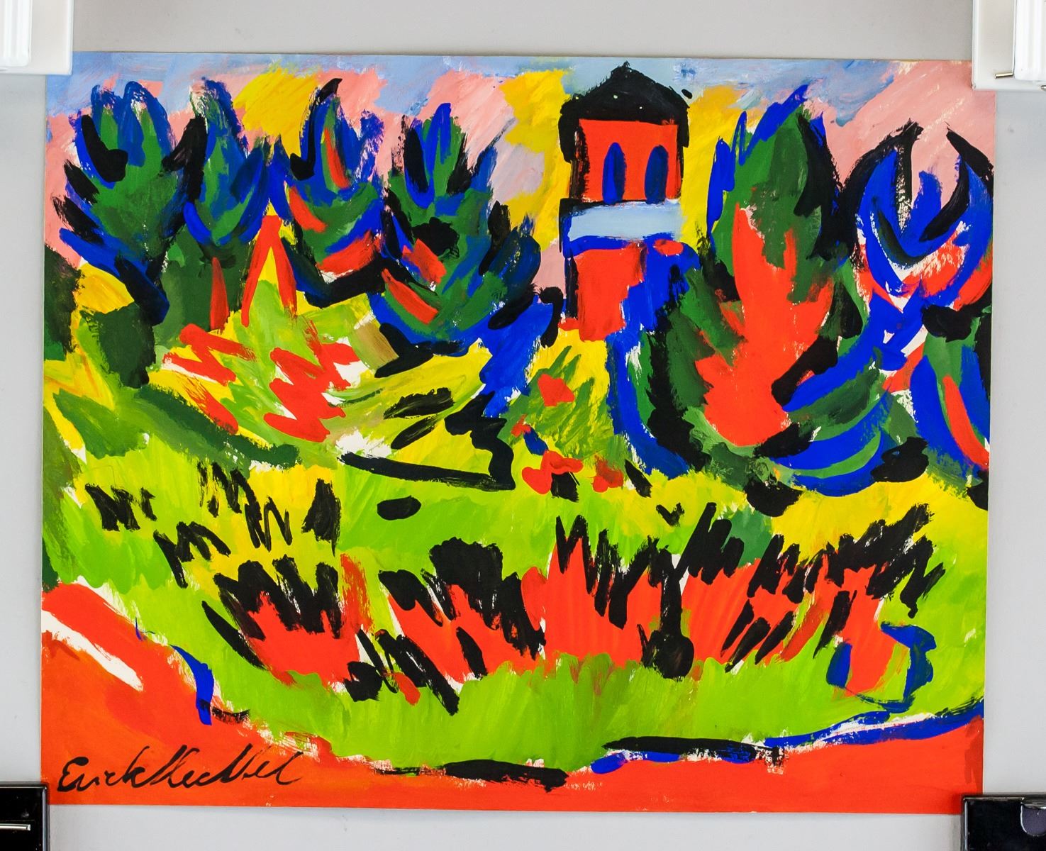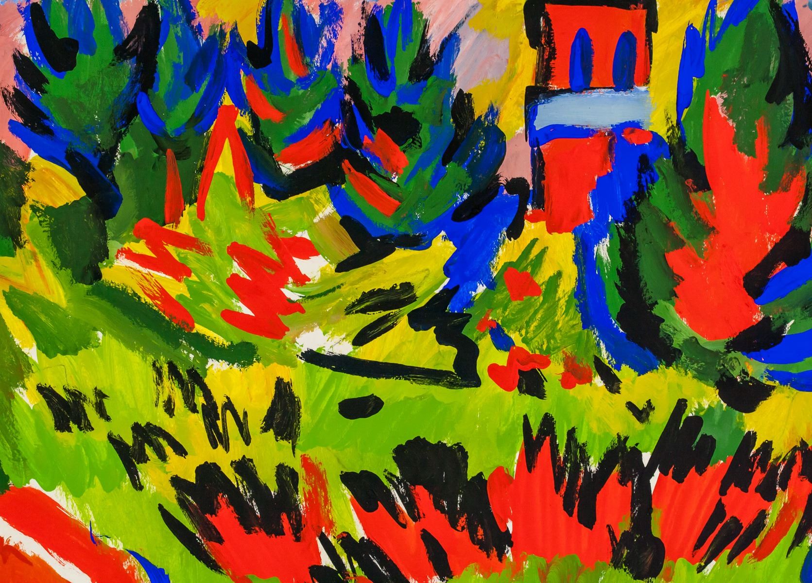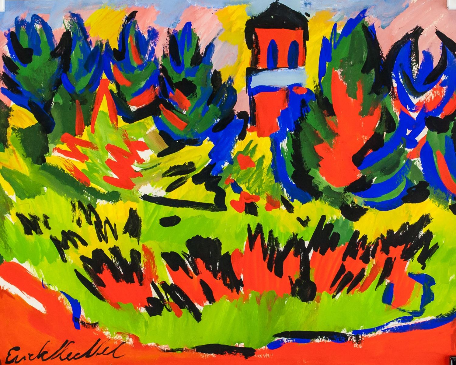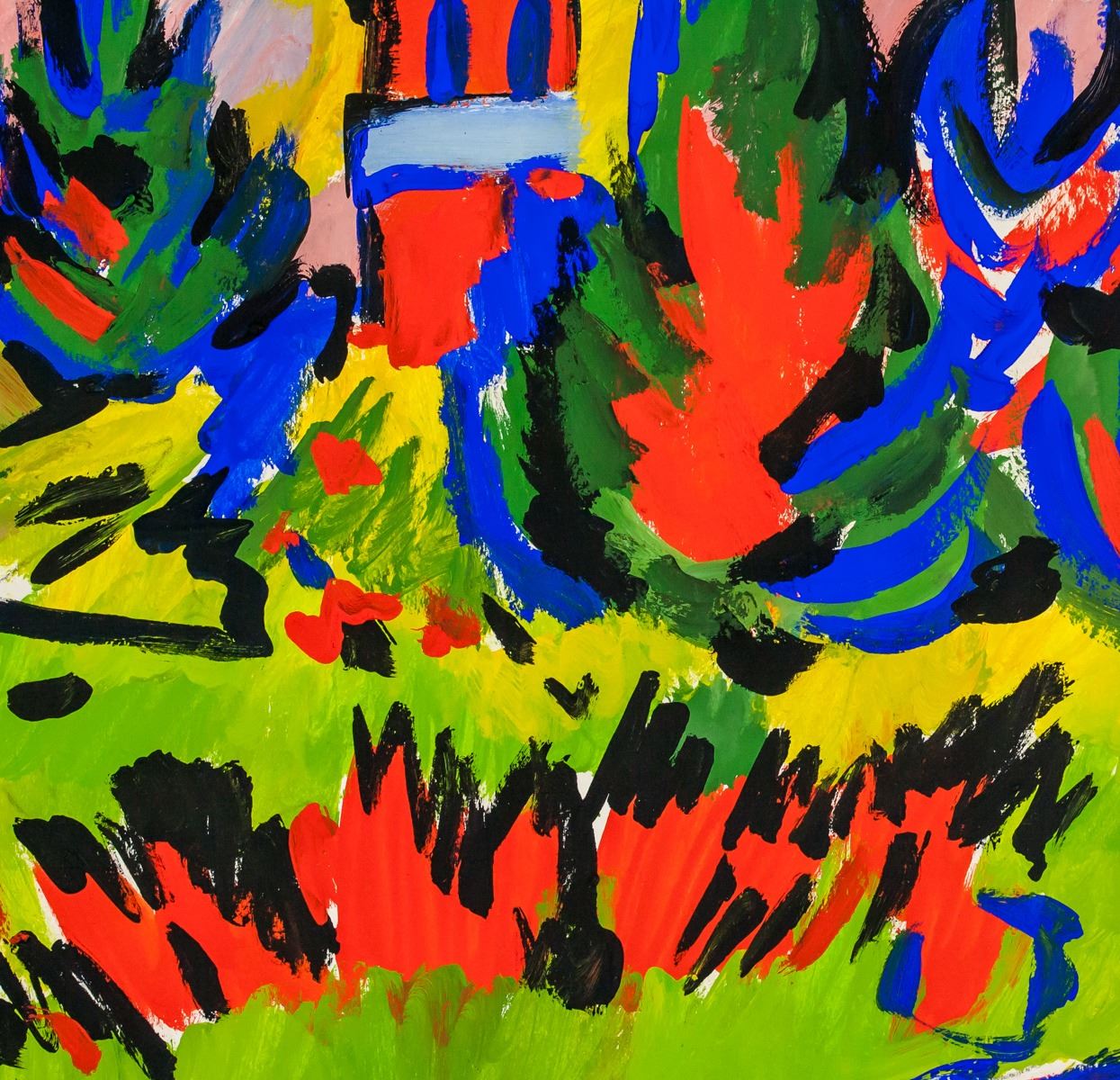 Oil and gouache on paper. Featuring an expressionist landscape scene. Signed illegibly on the lower left corner. Inscribed 725 and stamped BAUHAIS KUNSTGALERIE on verso. 19.5 x 25 cm (7.75 x 9.5 in). PROVENANCE: This lot carries limited provenance from a Southern Ontario estate