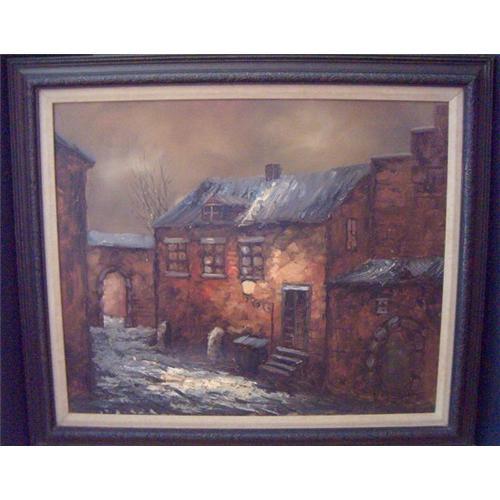This is a beautiful rendering in the European style. The scene when shown to a native German was said to be typical of many of the farms, with the arched entrance leading to where the animals were kept behind the homes. Hesinger is said to be a known artist, though not renowned. It certainly would be a worthy addition to your existing art pieces...