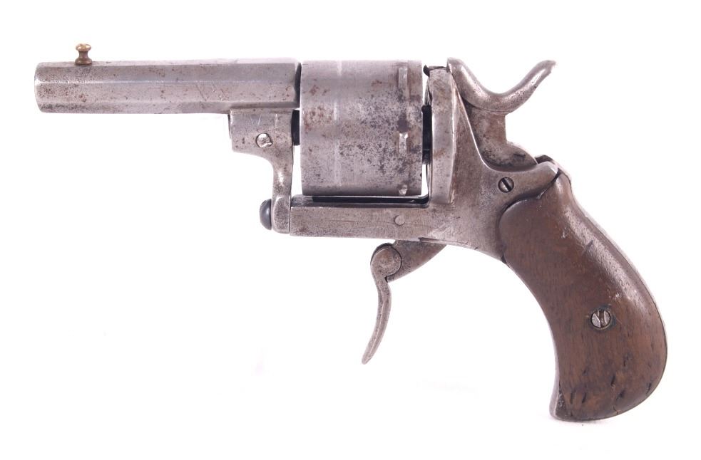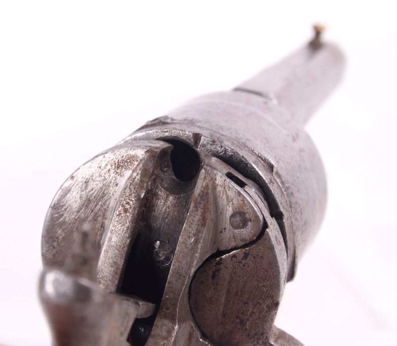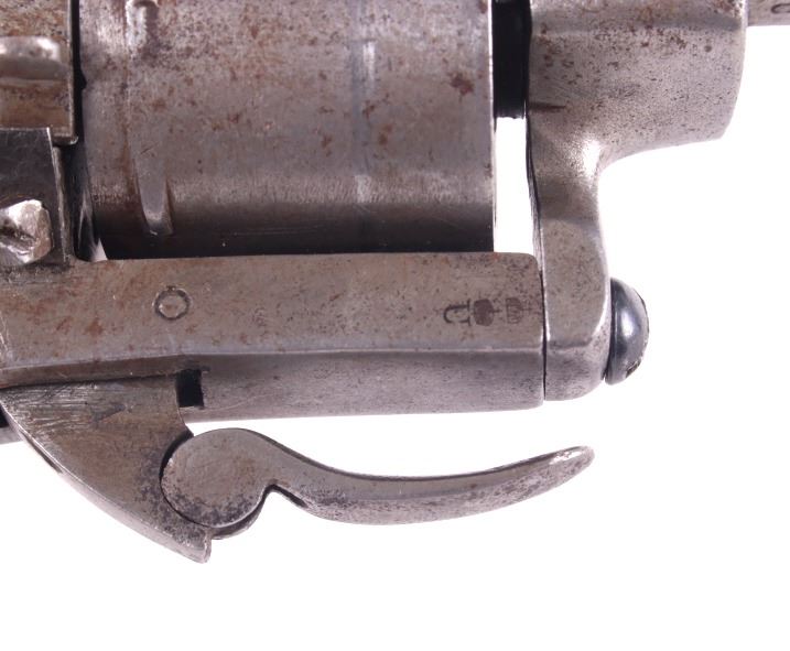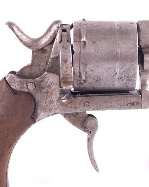 Included in this lot is a German Folding Trigger .32 caliber revolver. This revolver features a 2 3/8" long octagonal barrel with beaded front sight. The barrel is chambered in .32 and houses five rounds. The ejector is missing. The barrel and frame have a bright finish to them and are stamped with two crowns over a "U". The folding trigger and hammer have some play to them and will need to be worked on to get into firing condition. The walnut grips are in okay condition as there are chips and small cracks near the bottom. The bore is dark and there is no rifling. No Serial Number. This firearm qualifies as a Curio & Relic Long Gun, and requires FFL Transfer or NICS Background Check.