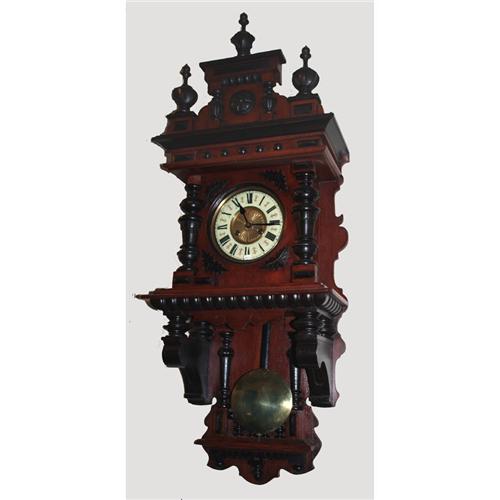 German Free Swinger Clock -Circular porcelain dial with Roman Numerals and minute ticks on outer ring. Decorative brass center.  Ornate case with fancy crown measures approximately 16 ½ " x 42" T.   Extra large pendulum.