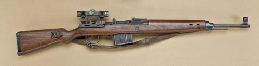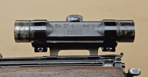German G-43 sniper rifle, 8mm caliber, AC (Walther) coded, serial #2432. Scope shows GWZF4 marking with dow in triangle – serial #32355. Mount shows waffen proofs. The magazine shows electric pencil #2432, whichis period, and magazine is AYE marked with waffen proofs also. The blue is a matching color. The stock shows two sets of waffen proofs on left side behind sling port, #2482 stamped in the belly of the stock with asmall “B”, and all other matching visible serial numbers. The scope shows blued spring steel and screw-type mounts. The optics are clear. The condition is very good plus overall. There is some erosion and pittingaround the eye-piece and front piece of scope. The action is good, bore is very good plus. The original to the period leather sling is included. Includes cleaning rod. The Walther made G-43’s are of higher qualitywith more blued steel parts and this is a far above-average example, at least very good plus. Referred to as “Hitler’s Garand” by many writers and historians. Just some normal aging to composite forend and some minor
