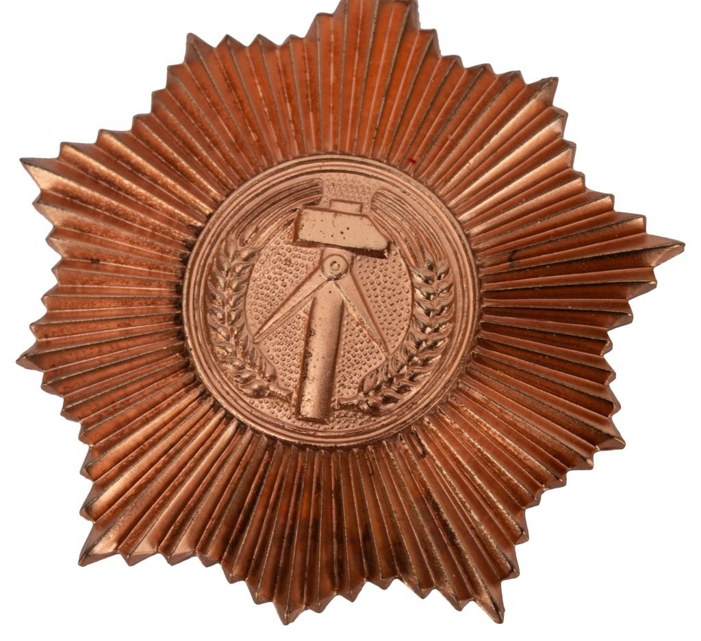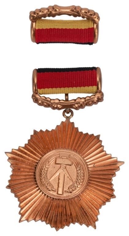 The Patriotic Order of Merit (German: Vaterlandischer Verdienstorden, or VVO) was a national award granted annually in the German Democratic Republic (GDR). It was founded in 1954 and was awarded to individuals and institutions for outstanding contributions to the state and society in various areas of life. Design: ten-pointed star, with a central medallion displaying the state crest of the GDR (East Germany)