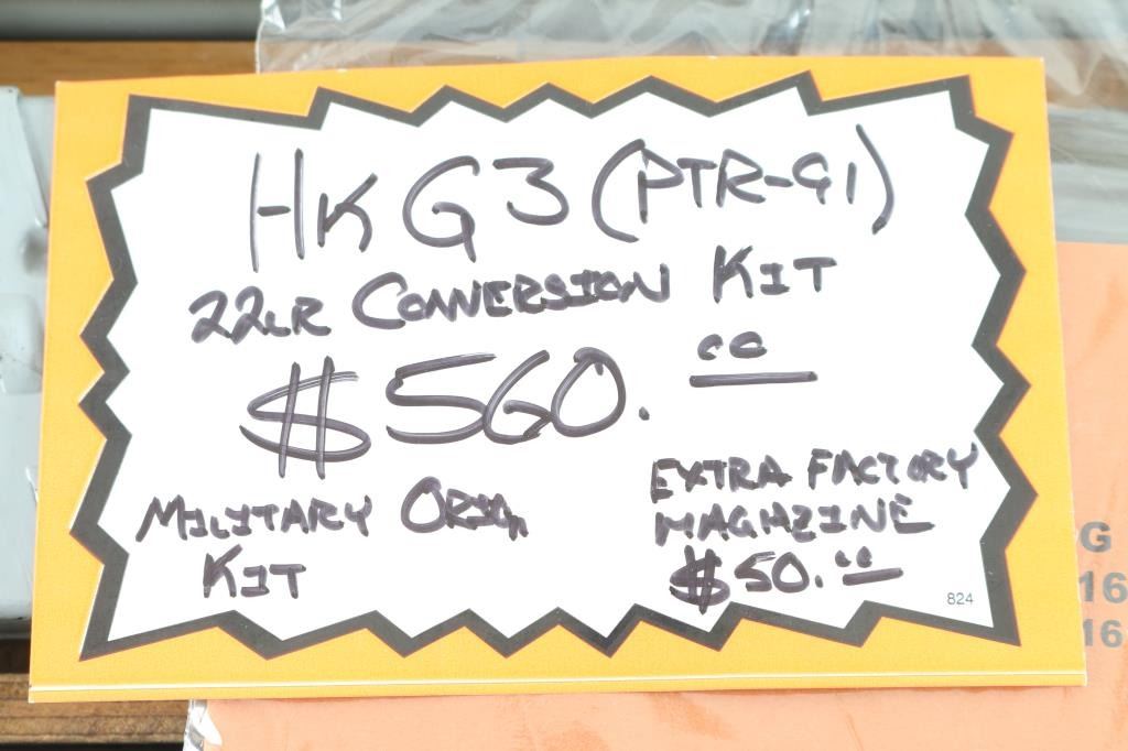 Vintage (1970's) German Military issued . 22 Cal conversion kit for the HK G31, PTR-91 HK 91 rifles. Used to teach the basics of marksmanship. Comes in the original 20x10x4" wooden box and includes two 10 rd .22 magazines, conversion bolt and barrel, tube, and cleaning kit. Manuals in both English, and German are included. Reduces recoil, and an inexpensive way to shoot. Very good condition. Barrel appears straight, with no observed bands or kinks or dents. Bore is very good condition.