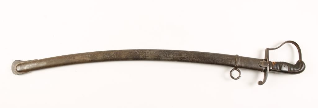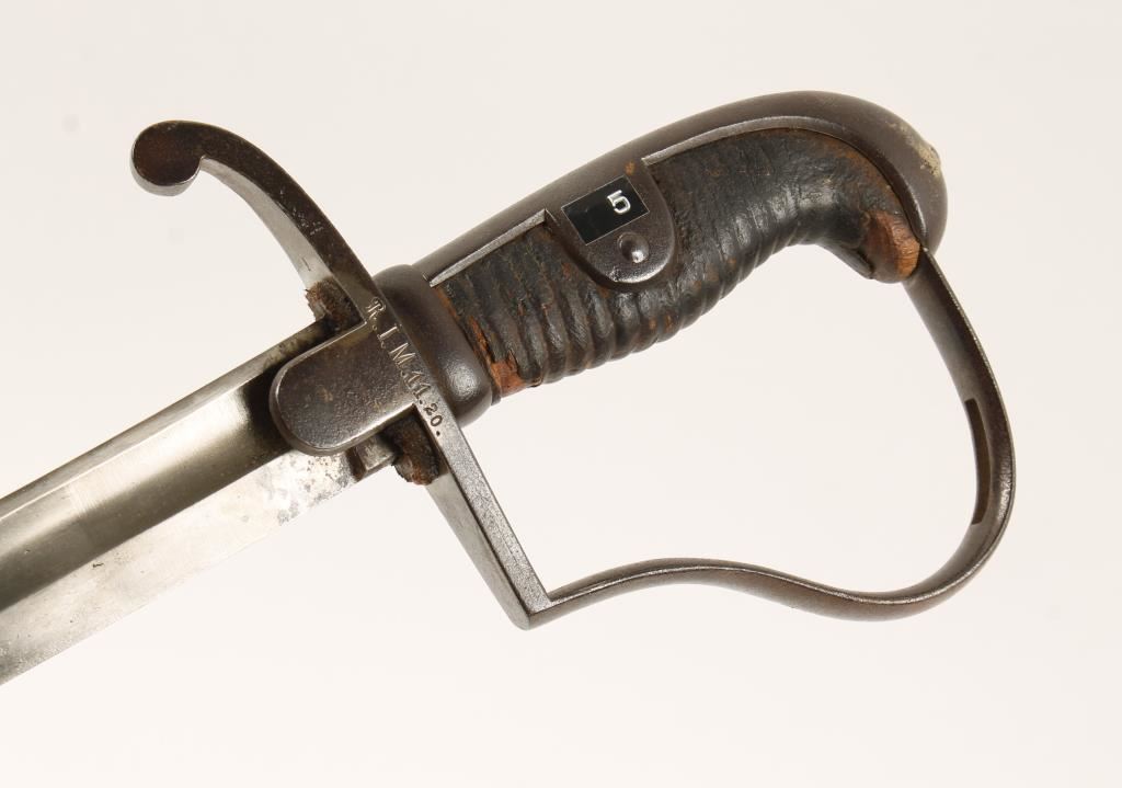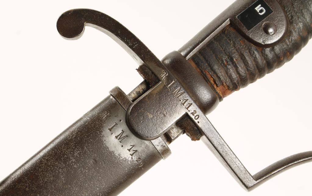 19th Century. Unit marked "R.I.M. 11. 20. on hand guard. Scabbard is marked "R.I.M. 11.20." matching. Also on top of blade marked W05 with crown at the top. Measures 36" overall with a 30" curved blade. Shows age and use with surface rust and mottling.