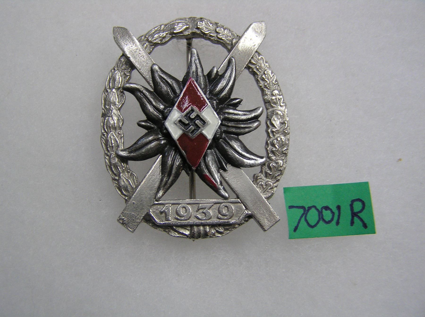 German Hitler youth expert skier badge antique silver with red, white and black paint WWII style high quality reproduction collectors, re-enactors,historical or theatrical collectors piece est. value $75.00-$80.00