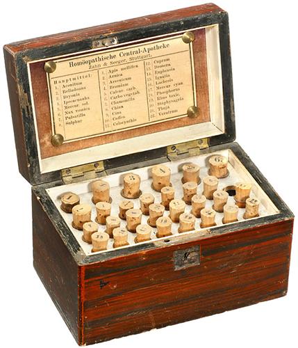 Homöopathische Central-Apotheke, um 1900 Hersteller: "Zahn & Seeger, Stuttgart", Holzkästen für 30 Medikamente, mit 29 Glasbehältern, inklusive numerierte Korkenverschlüsse, Maße: 15 x 9 x 9 cm. - Attraktives Sammlungsstück!