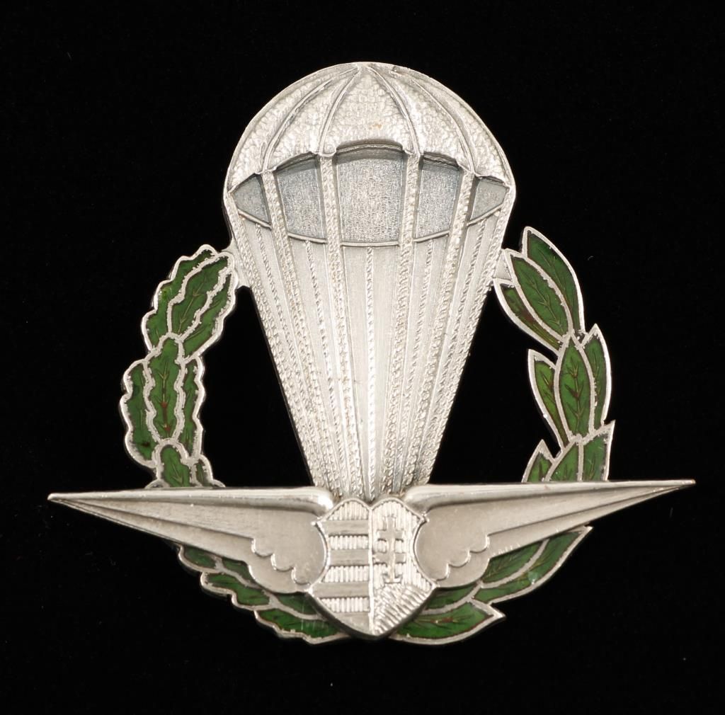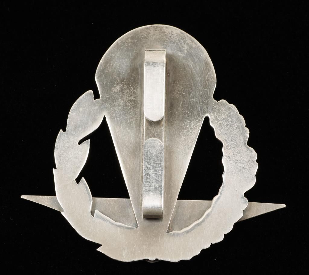 Measures 2-1/2" wide by 2-3/8" tall. Has two flat clips on the reverse side for securing to the tunic breast. Two piece nickel construction with green enamel.