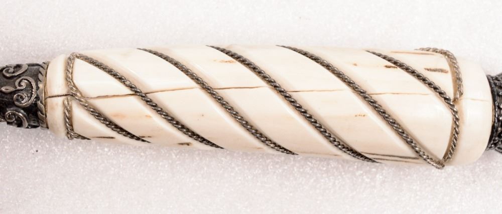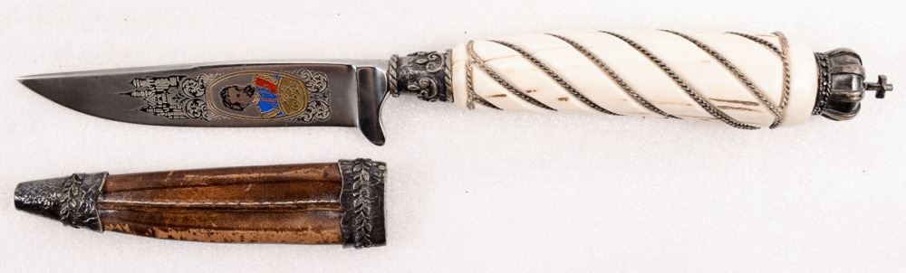 This fixed blade knife has a stag grip and German silver fittings. The blade is marked "ANTIK, Gebrauches Musterschutz, Handmade, Rostfrei, Solingen, on one side and an image of King Ludwig II and his castle on the other. Measures 10" overall with a 3 7/8" blade. The sheath's leather has some wear, but is in good shape. There are some cracks to the grip.