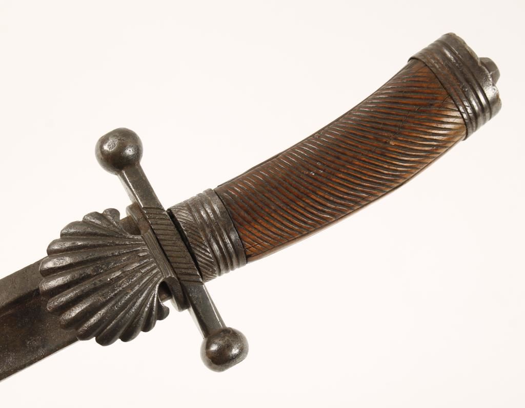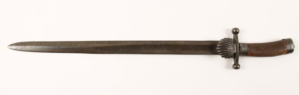 Hand chiseled blade, wood handle with metal shell ornamentation. Unmarked.17th or 18th century. Good condition, shows age. Measures 24" overall with a 19" blade.