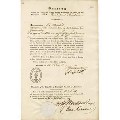 <B>[German Immigrants in Texas] Partly-printed Document Signed.</B></I> 1 page, 9" x 13.5", Antwerp, October 28, 1845 in German: <I>"Vertrag zwichen dem zum Schuke deutcher Einwanderer in Texas und dem Auswanderer Nic[holas] Weishie nar Wiesbaden..." </B></I>(Translated: "The cosignatory, Nic Weisheit hereby confirms that the Society named hereinabove, represented by their assignee...received the amount of 50 fl. rh., Fifty Gulden (florins) for his migration to Texas. By acknowledging the receipt of the amount named hereinabove, he is particularly obliged to abstain from seizure and the right of ownership of the land given to him by the Society until the debt in the amount named hereinabove is paid off by providing services to the Society, and upon discretion of the General Commissioner in Texas. For this purpose, the parties agree that the salary for one working day as a day laborer will be 1 fl. and as a craftsman 1 fl. and 24 thaler. In addition, the debtor is allowed to pay off his remaining debt in cash at any time..."). Bears the embossed paper seal of the Texas consulate at Antwerp. <BR><BR>The Society for the Protection of German Emigrants to Texas was responsible for the emigration of several thousand Germans. Known as The Mainzer Verein or more briefly the Adelsverein, the society had its beginning at Biebrich on the Rhine in April, 1842, when a group of German noblemen met to consider ways and means of purchasing lands in Texas and sending there German emigrants. Two representatives were sent to Texas and as a result the Society in the fall of 1843 took under consideration a project submitted by Bourgeois d'Orvanne to acquire a participation in his colonization contract with Texas of June 3, 1842. The Society was organized formally at Mainz, on March 25, 1844, under the name of Verein zum Schutze deutscher Einwander in Texas [Society for the Protection of German Emigrants in Texas], and on April 7, 1844, the formal agreement with Bourgeois was closed. Light creases, just a hint of toning at extreme margins, else very fine condition with dark crisp printing and engrossments. <I>From the collection of Darrel Brown.</B></I><BR><BR><b>Shipping:</b> Flat Material, Small (<a target="_blank" href="http://www.heritageauctions.com/common/shipping.php">view shipping information</a>)