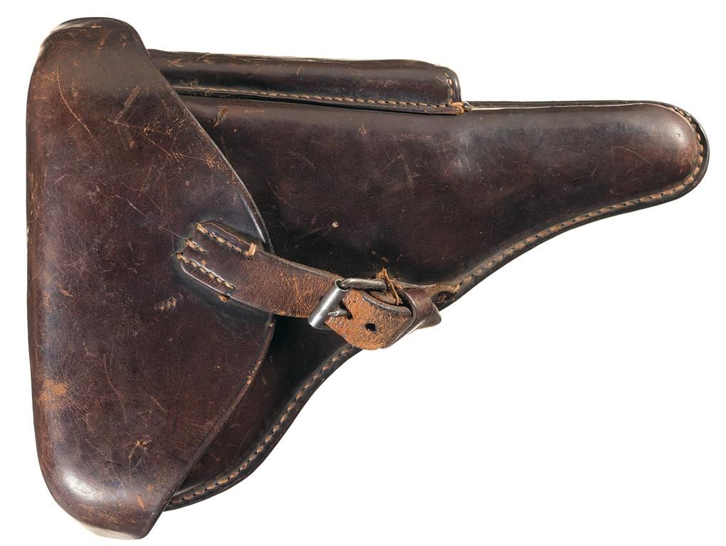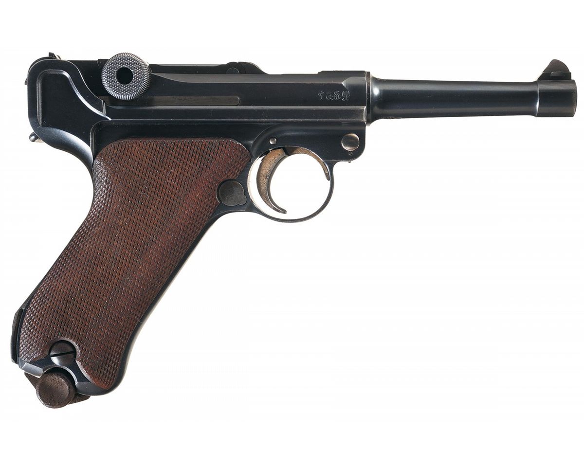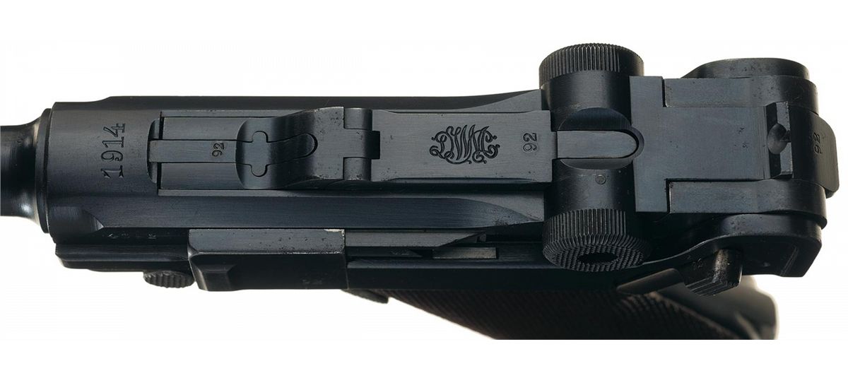 This is an early production 1914 dated Imperial German Luger. This example was manufactured in the first production series as it does not have any letter suffix on the serial number. It has the early "Bohler" steel marked barrel. These are usually only seen on the early WWI Lugers. The top of the chamber is dated 1914 and the front toggle is marked "DWM". The right side of the barrel extension has the three crown over Gothic letter proofs next to the Imperial eagle proof, which is also stamped on the rear of the barrel and left side of the breechblock. Correctly numbered in the military fashion full serial number (4692) on the frame, barrel extension and underside of the barrel. The last two digits of the serial number (92) on the smaller parts. As noted the barrel is marked "Bo 26" on the underside. Standard safety area and extractor markings; "GESICHERT and GELADEN" with standard fixed sights. It is fitted with a WWI type nickel plated magazine with the wooden base that is stamped with a Crown/Script letter proof. Complete with a dark brown leather holster, marked on the inside "J.M. ECKART/ULM/1913".