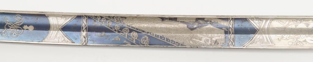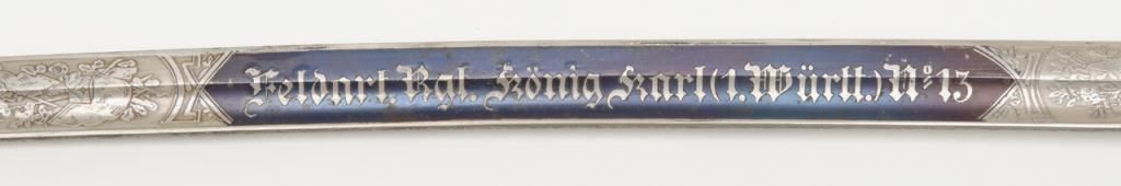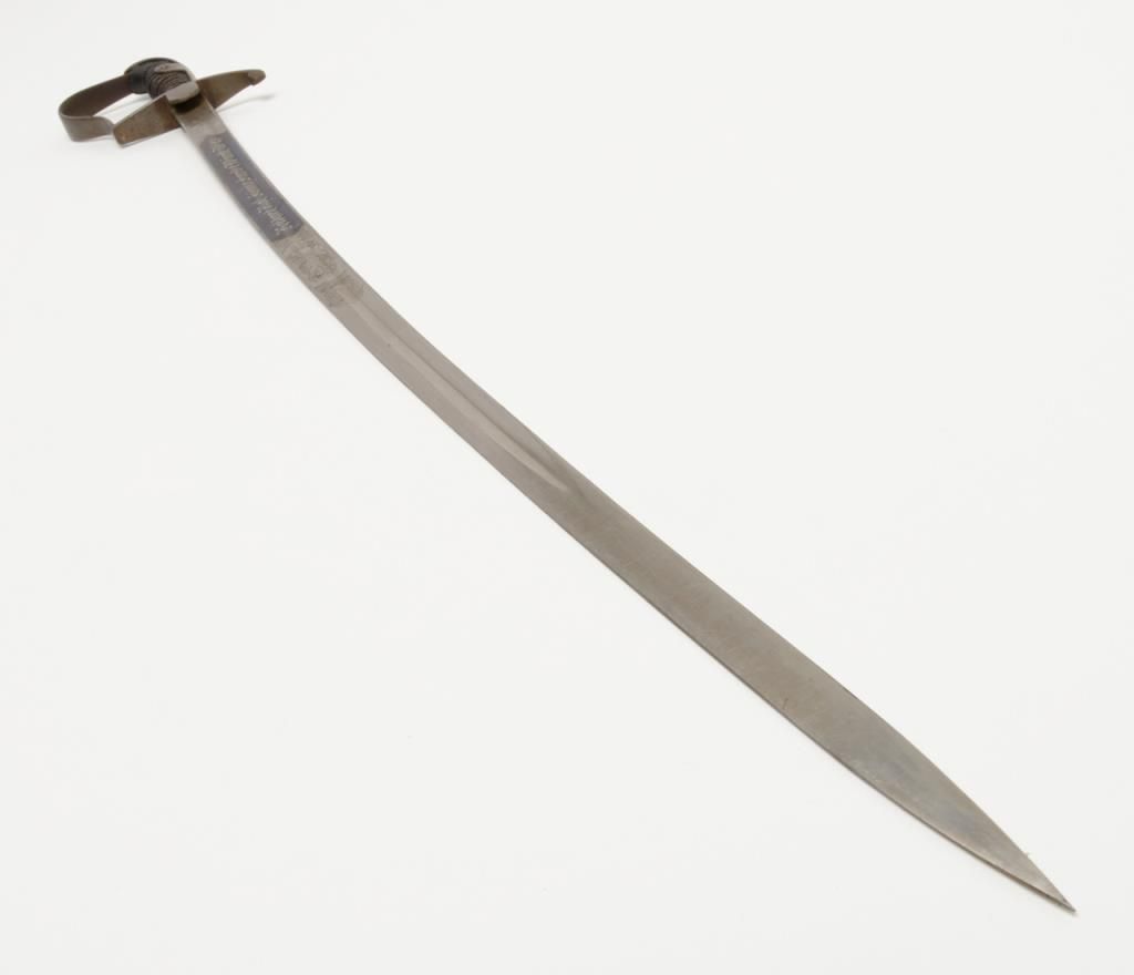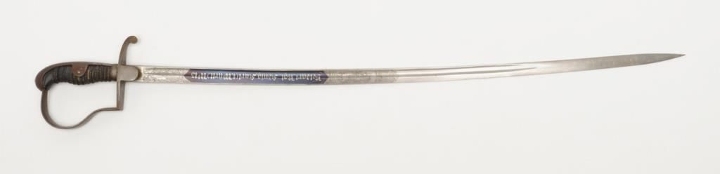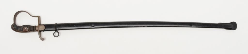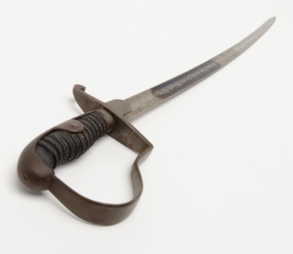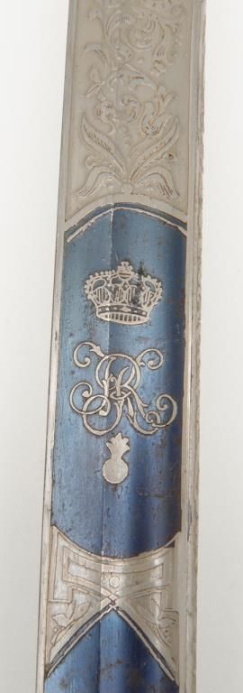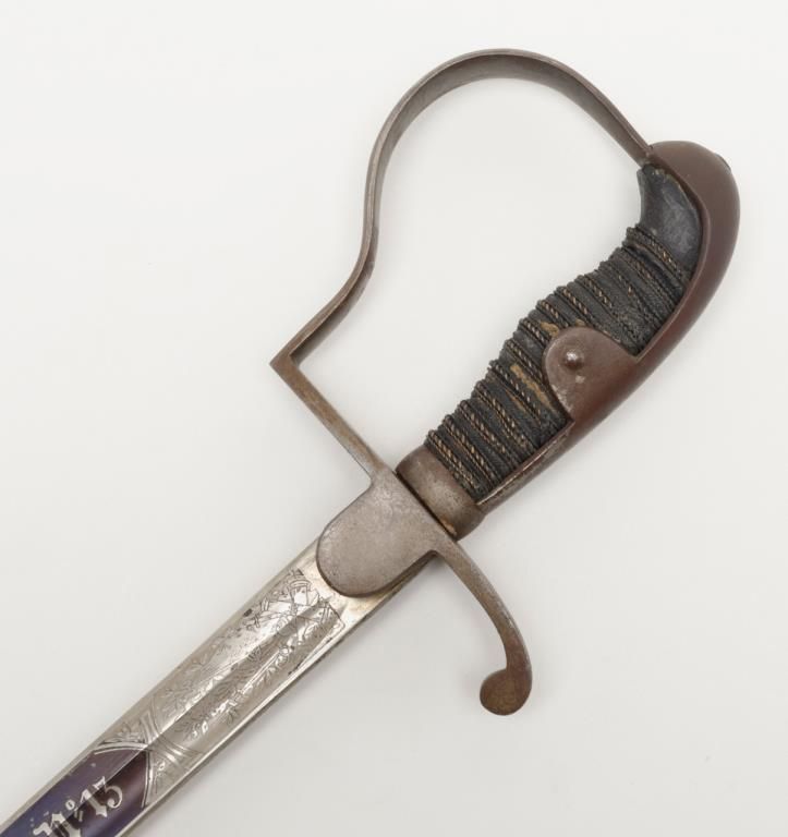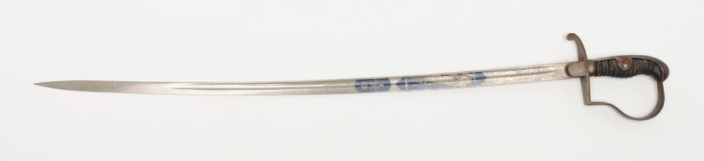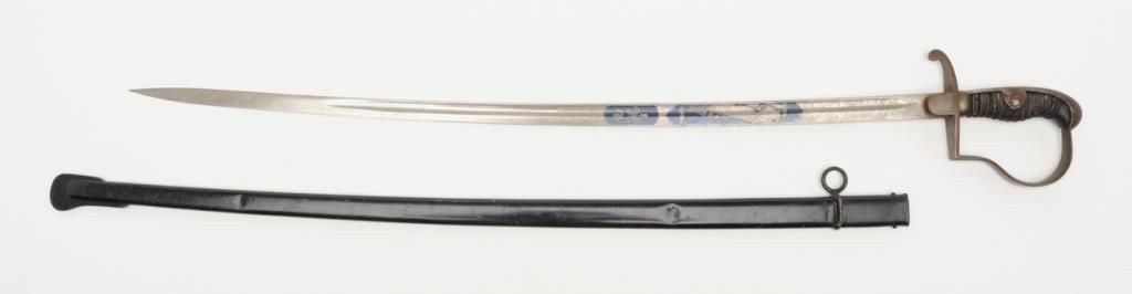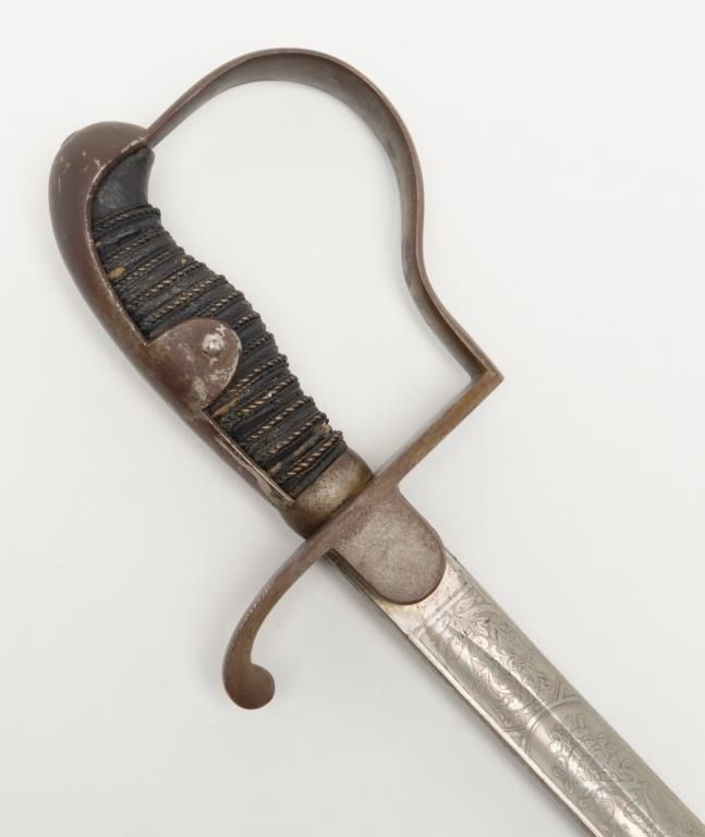 German Imperial officer’s sword with plain iron hilt and fancy etched and blued blade circa late 19th to early 20th-century. The blade shows an etched panel with unit marking and a fancy panel showing a palace or government buildings on thereverse. The blade is in very good plus to near fine original condition with at least 90% original blue and nickel just aging and toning slightly with no polishing or cleaning. The scabbard shows most of its black paint with a few dents andscratches. The hilt shows a dark brown patina. The grip is good retaining its wrap with just some slight normal aging. Est.: $400-$800