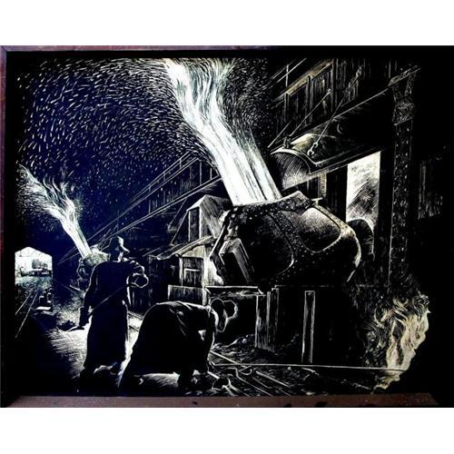 A fantastic oil on canvas , Men working at iron foundry , painted in Black and white oil , by an unidentified German master between 1950 and 1960 , You may ask why do we know that , first by precedence this artwork belonged to a experienced collector owing just quality pieces, , but please check the composition with a single strong diagonal dividing the work with a strong perspective , and two diagonals (melters) dividing the vertical space to create a dimensional feeling just where the melted iron burns with fantastic sparks , filling the black spaces with a dynamic light , same technique used by Van Gogh at Starry Night . The use of a bright left down corner , also contributes to create a dimensional feeling , the painting looks so deep ! it is hard to believe is just a plain oil work . Very important size of 59 inches wide ( 150 cm) and 47 inches tall ( 120 cm).