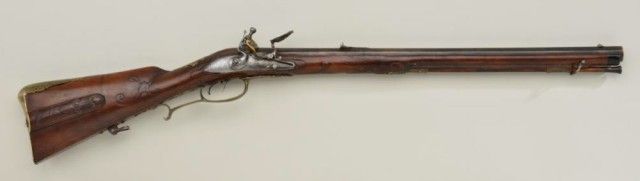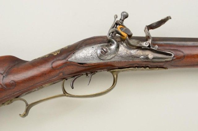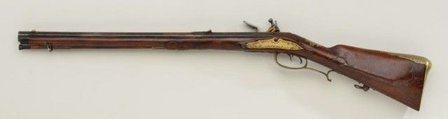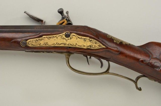 German JAEGER rifle circa mid to late 18th century with engraved brass mounts and lock showing hunting and game scenes. The rifle measures 38" overall with a 23-1/2" barrel of approx. 62 caliber showing 7 deep grooverifling. The lock is in excellent reconversion to Flint and the patch box door cover also expertly restored and carved to match. Both the hammer and brass mount on patch box door have been engraved to match.The stock shows good quality carving and molding and has been lightly refinished. The lock and barrel also show some light restoration and re-coloring. A matching horn, forend and ramrod are included. A good Jaeger with well done restoration. Est.;$1,750-$3,500.