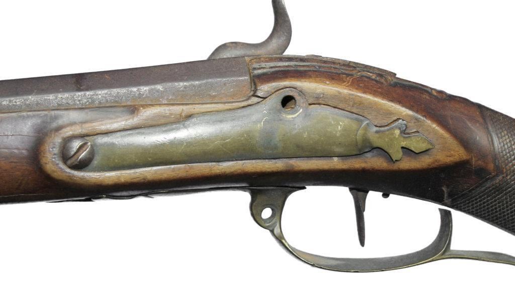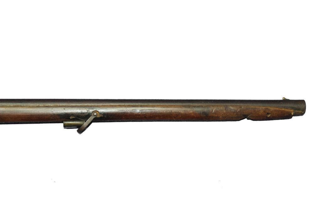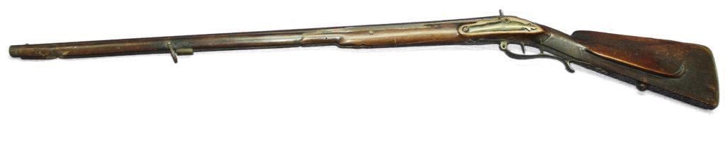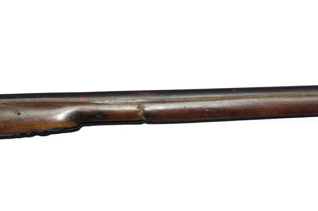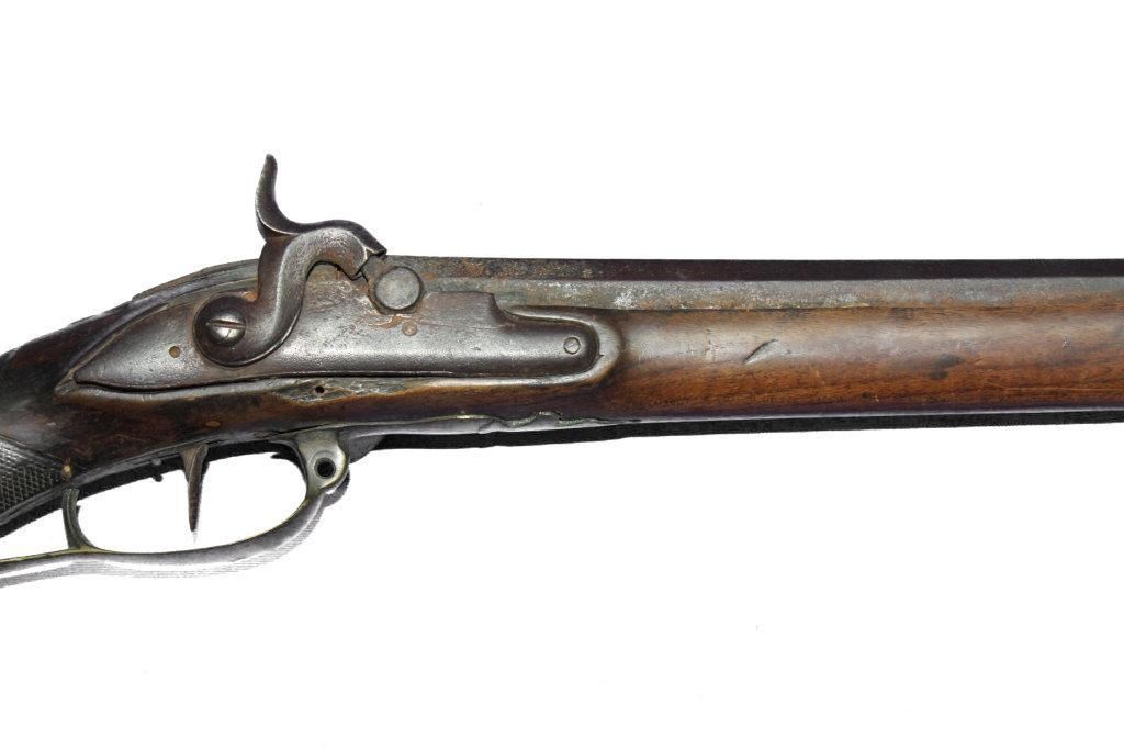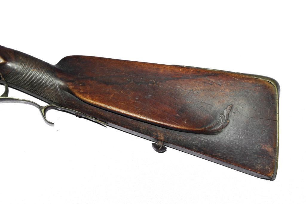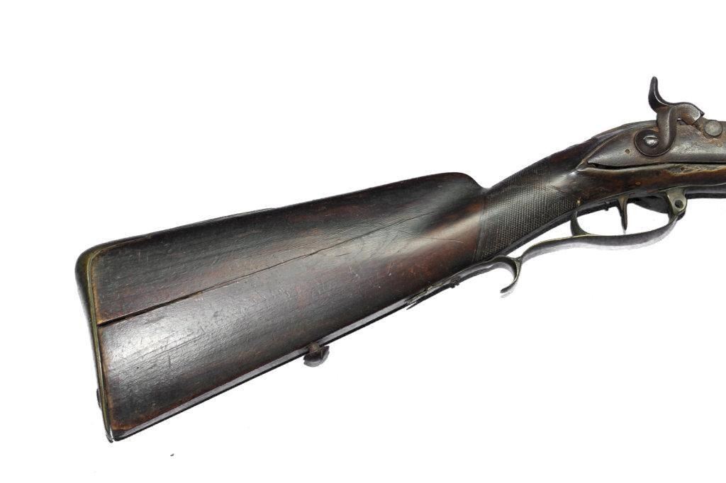German Jaeger Muzzleloading .574 bore shotgun. 31 1/2" barrel length, converted percussion. Believed to be an original German Jaeger, having a nicely carved straight grip checkered walnut stock, with cheek rest being carved at transition toward butt. Stock showing major damage, having losses and cracks, missing grip cap, front ramrod pipe & ramrod, brass retainer plate missing a screw. Brass butt plate and trigger guard both showing light wear. Lock lightly pitted and appears fast. Trigger guard has hole in front for sling attachment with forwarding mounted swivel. Brass fixed front sight.  - 9976-032418-PB-00943