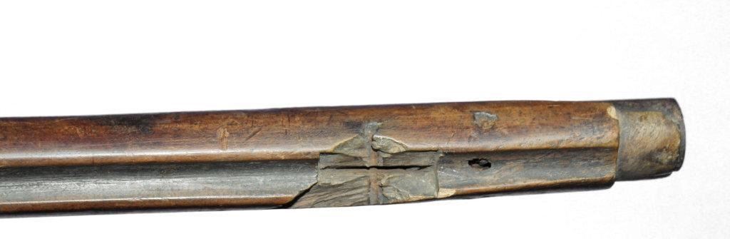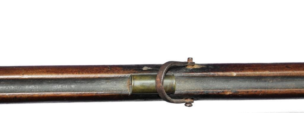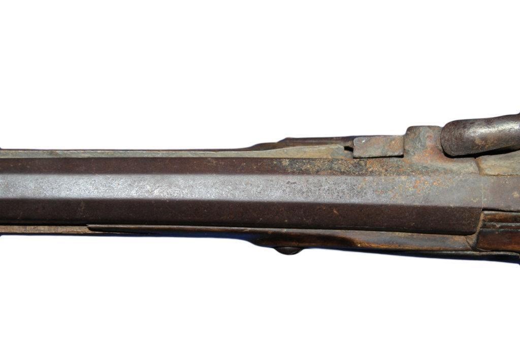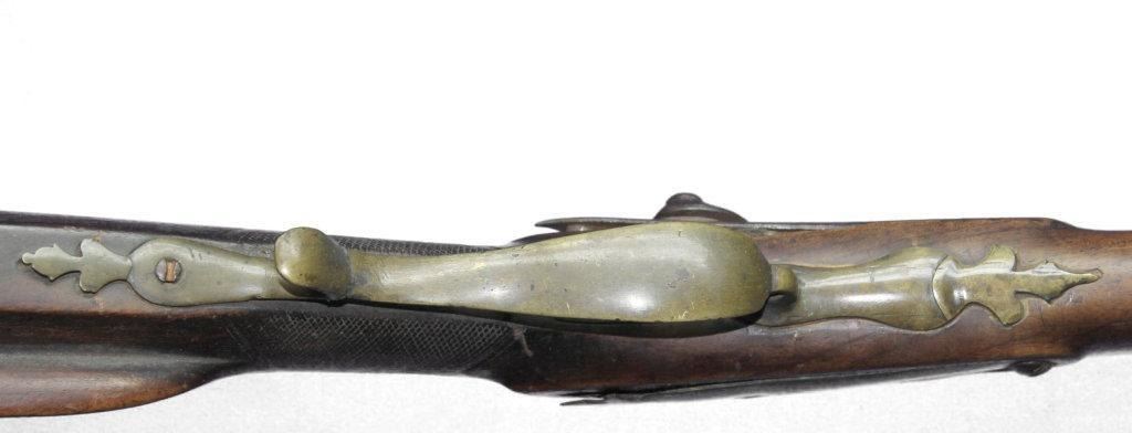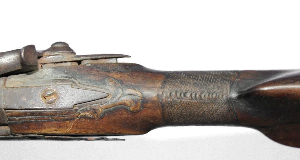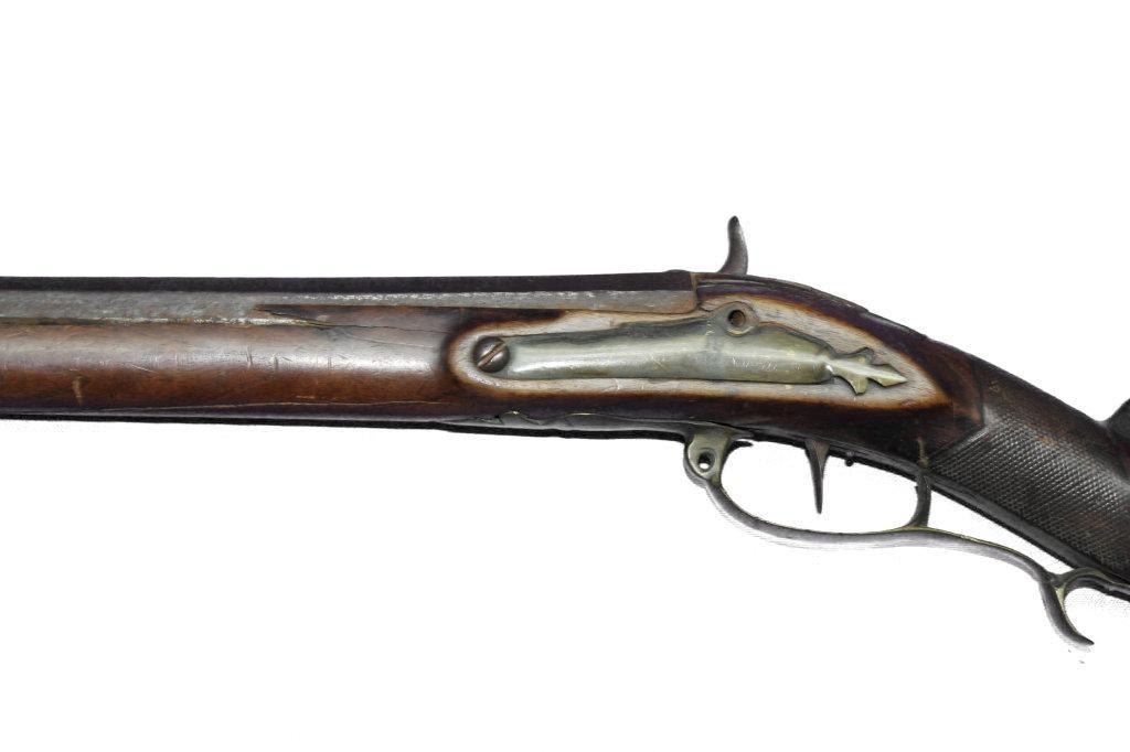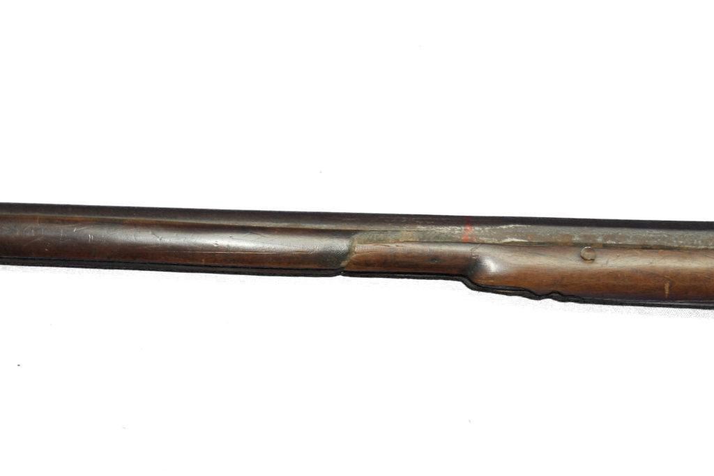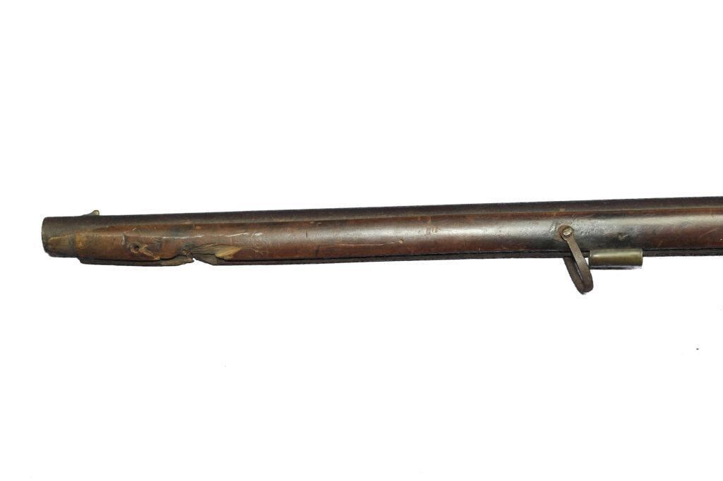 German Jaeger Muzzleloading .574 bore shotgun. 31 1/2" barrel length, converted percussion. Believed to be an original German Jaeger, having a nicely carved straight grip checkered walnut stock, with cheek rest being carved at transition toward butt. Stock showing major damage, having losses and cracks, missing grip cap, front ramrod pipe & ramrod, brass retainer plate missing a screw. Brass butt plate and trigger guard both showing light wear. Lock lightly pitted and appears fast. Trigger guard has hole in front for sling attachment with forwarding mounted swivel. Brass fixed front sight.  - 9976-032418-PB-00943