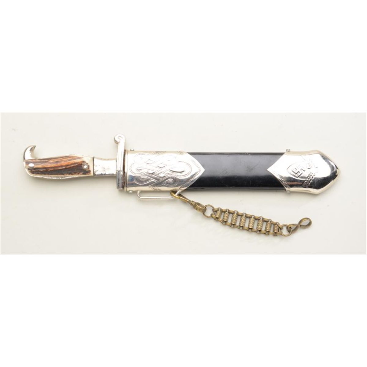 German Labor Corp hewer or dagger with metal sheath and metal articulating hanger, blade is RZM marked and etched “Urbeit adelt”; stag grips are likely replacements and the mounts have been heavily cleaned and are loose; the sheath is overall very good. Est.: $300-$600.