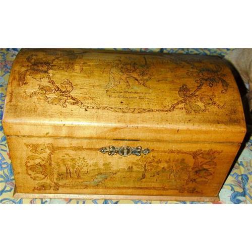 We are pleased to offer a magnificent German lady's sewing box. Wonderfully decorated it has two sheves inside that are divided into a series of little compartments for threads etc. Underneath the two sheves is a satin covered bottom probably for other accoutrements.