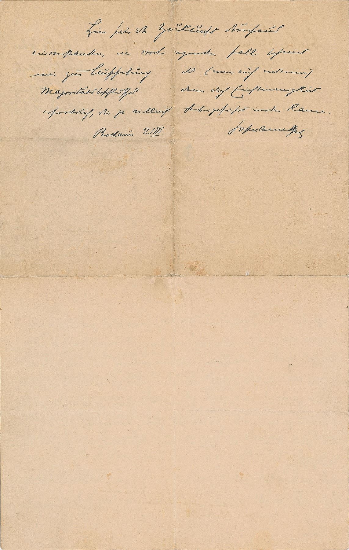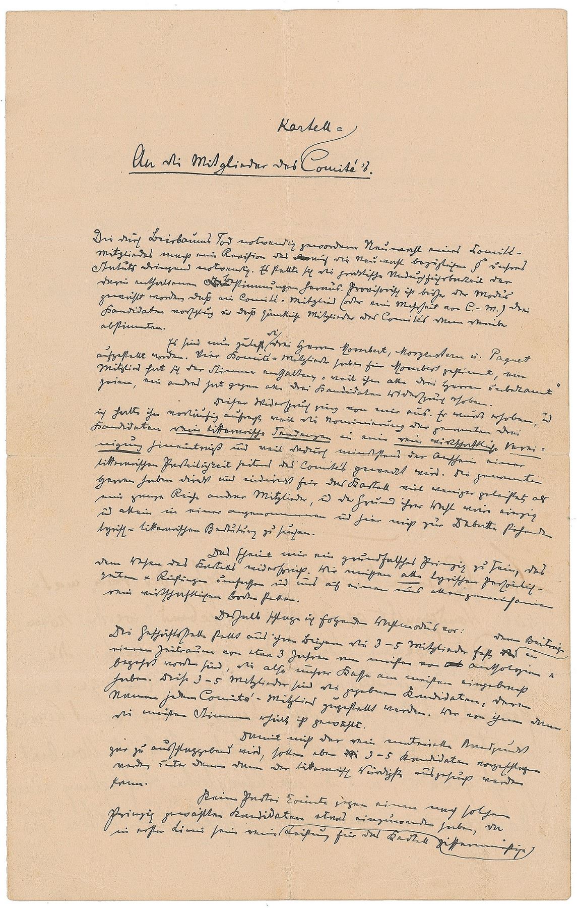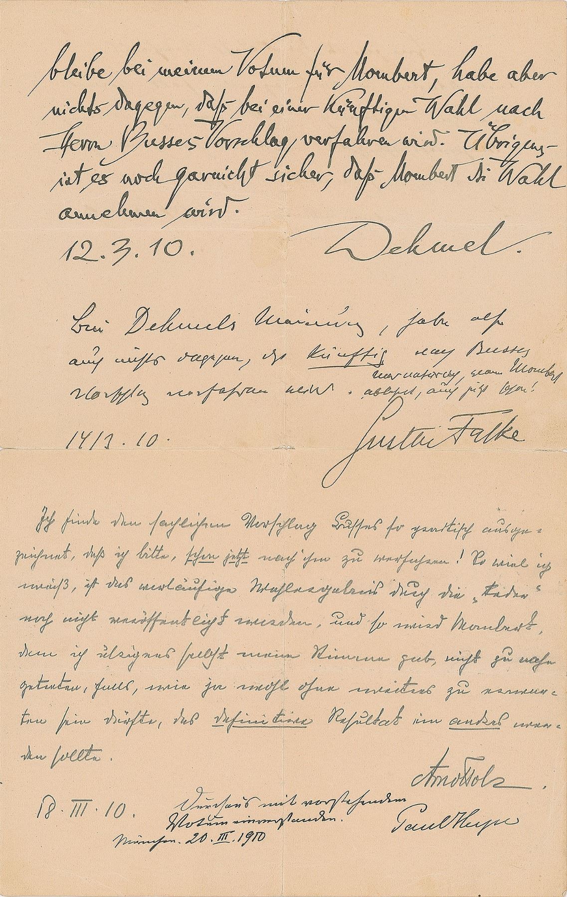 Important manuscript DS in German, signed “Carl Busse," "Dehmel," "Gustav Falke," "Arno Holz," "Paul Heyse," and "H. von Hofmannsthal,” four pages on two adjoining sheets, 8.25 x 13, March 1910. A handwritten letter from the German lyric poet Carl Busse to other members of the "Kartell lyrischer Autoren,” a cartel founded in 1902 to protect the rights of German lyricists to earn money from their writing; founded by Richard Dehmel and Arno Holz, the cartel soon grew to more than a hundred members. The letter features autograph responses from five other committee members—Richard Dehmel, Gustav Falke, Arno Holz, Paul Heyse, and Hugo von Hoffmannsthal—and sheds light on the internal workings of the cartel, in particular a disagreement among the committee: Alfred Mombert has been elected to the committee, but questions have been raised about the election process. Busse's letter suggests another election following a new procedure, to which the other members respond. Dehmel writes (translated): "I stand by my vote for Mombert, but have nothing against proceeding according to Herr Busse's suggestion at a future election. Incidentally, it is not yet at all certain that Mombert will accept the nomination." In very good to fine condition, with small splits along moderate intersecting folds. Incidentally, Mombert did not join the committee in 1910, but only in 1914, after the death of Paul Heyse.