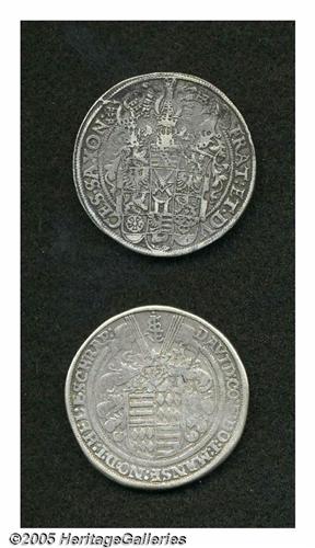 <B>Early Taler pair including:</B></I> Saxony Three Brothers Taler 1597, Dav-9820, VF with small obverse scratches; and a Mansfeld-Eigentliche-Hinterort Taler 1603-GM, Dav-6974, KM7, VF.