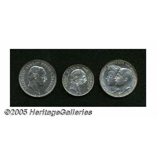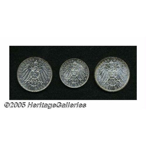<B>High-grade trio consisting of:</B></I> Saxe-Weimar-Eisenach 3 Mark 1910A, KM-Y176, Choice AU; Saxony 2 Mark 1904E, KM1261, AU; and a Saxony 3 Mark 1908E, KM1267, lightly abraded UNC.