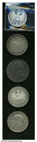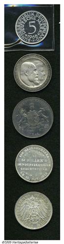 <B>Miscellaneous lot as follows:</B></I> Bavaria 3 Mark 1914-D, KM520, XF; Frankfurt Taler 1859, Schiller Centennial, KM359, Proof with light handling marks; Wurttemberg 2 Gulden 1848, KM595, XF with questionable toning; Wurttemberg 3 Mark 1911-F, Silver Wedding, KM636, XF; and a Federal Republic 5 Mark 1968-F, KM112.1, Gem Proof. <B>A sold as is, no return lot.</B></I>