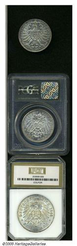 <B>Scarce Saxony Duchy Types: </B></I>Saxe-Altenburg KM147 5 Mark 1903A, MS63 PCI - this coin has an odd texture to the surface, but appears to be fully lustrous. It may have been lacquered at one time, and thus salvageable; Saxe-Weimar-Eisenach KM-Y176 3 Mark 1910A, AU55 PCGS; and Saxe-Weimar-Eisenach KM-Y177 3 Mark 1915, toned XF. <B>Sold as is, no returns lot.</B></I>